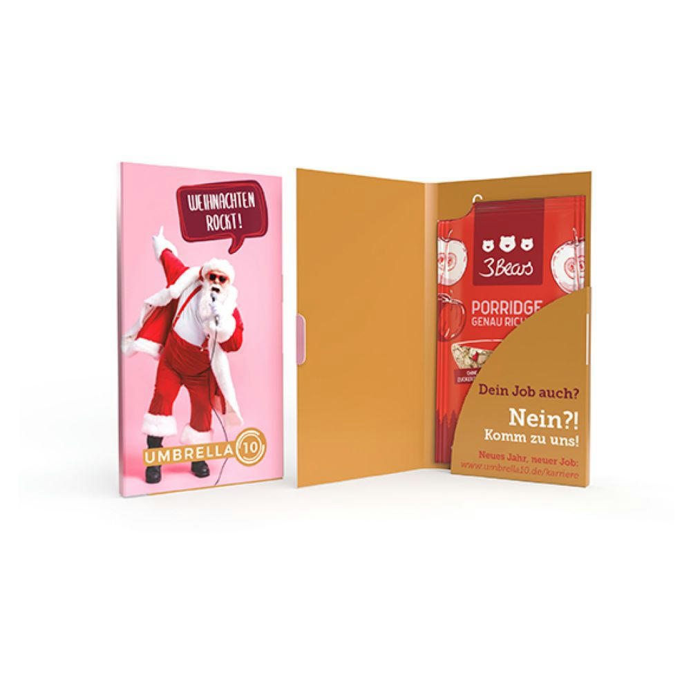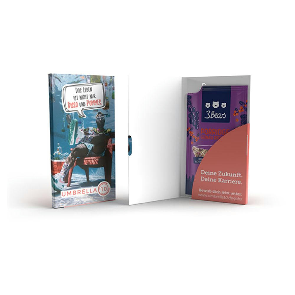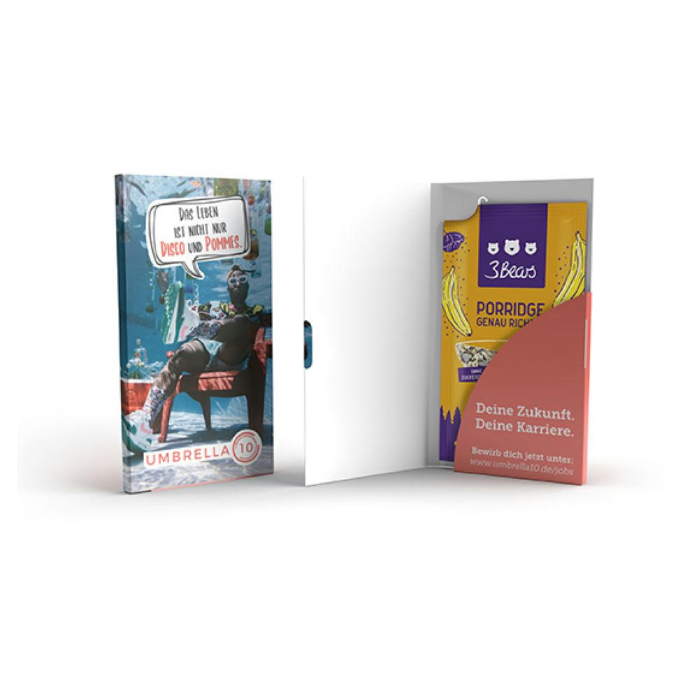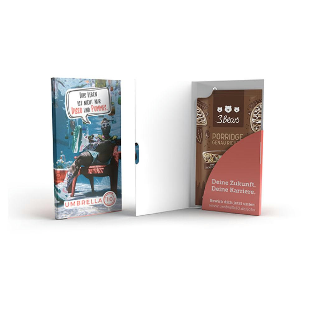 Gesund werben mit einem leckeren Porridge mit mindestens 30% Fruchtanteil und vollwertigen, ganzen Haferflocken. Die köstlichen Porridge Variationen von 3Bears kommen in einer praktischen Mappe aus FSC®-zertifiziertem Karton. Die Mappe kann rundum individuell veredelt werden. 3Bears Porridge | 50 g | Feiner Kakao | 4c Euroskala einseitig