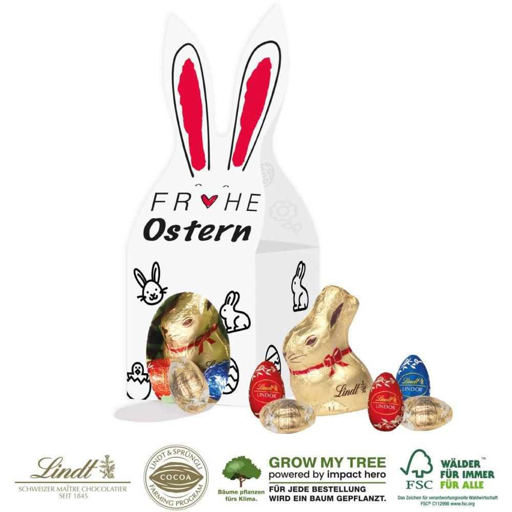 Für Genießer! Genussmomente zu verschenken, ist eine besondere Wertschätzung. Die zartschmelzende Lindt Schokolade kommt garantiert immer und überall gut an! Die schöne Verpackung mit Hasenohren ist rundum individuell gestaltbar.. Produktdetails: Individuelle Präsentverpackung aus hochwertiger Kartonage mit süßer Füllung.. Nachhaltigkeit: Für jede Bestellung mit uns wird ein Baum über GROW MY TREE gepflanzt. Wir verwenden FSC® zertifizierten Karton aus nachhaltiger Forstwirtschaft und anderen kontrollierten Quellen.