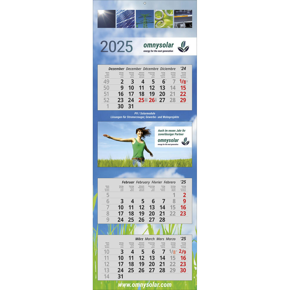 4 Block-Wandkalender mit bis zu vier Werbeblättern im Hauptmonat, leichter Abriss durch Kopfleimung. Made in Germany. Optional im Einzelversandkarton, für Versand als Maxibrief. Preis inklusive individuell bedruckter 4c-Umverpackung und 4c-Druck auf den 12 Werbebannern (bis zu 4 verschiedene Motive).