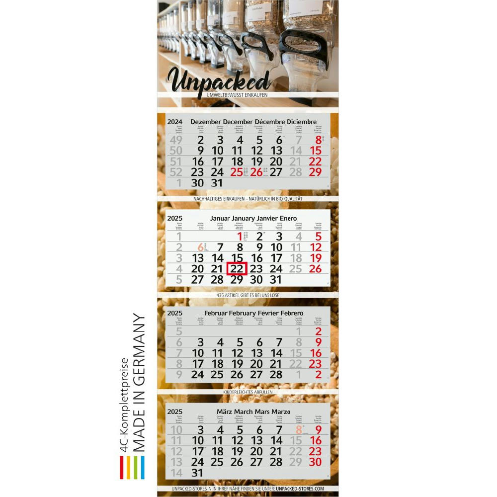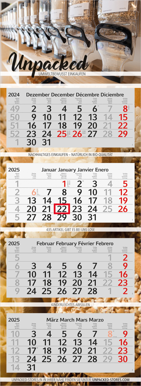 Rückwand individuell gestaltbar. Kalendarium Deutsch 4 sprachig D/GB/F/E, hellgrau/rot. Kalenderblöcke einzeln perforiert. Portooptimiert zu versenden: Rückwand zum viermaligen Falten gerillt. Aufhängeöse aus Metall. Datumsschieber rot. Made in Germany. 4c-Druck inklusive.