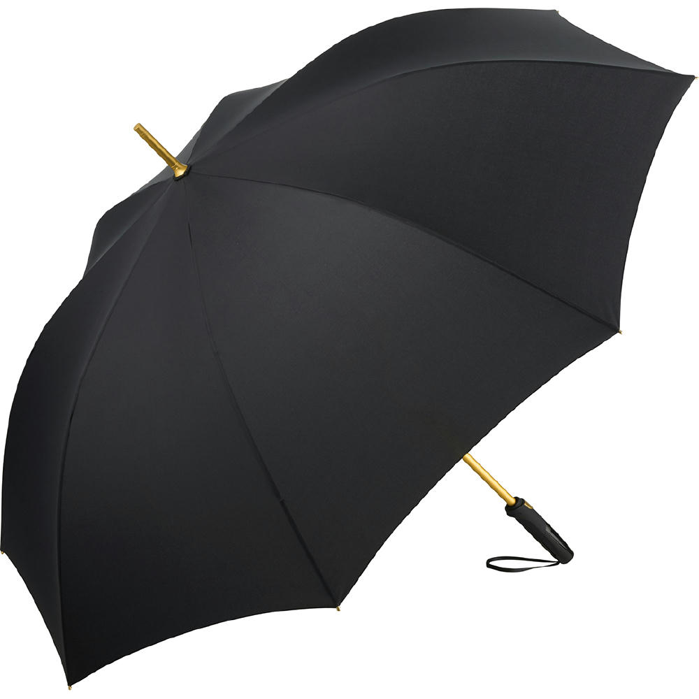Edler Automatik-Gästeschirm für zwei Personen mit Elementen in Metallic-Farben. Komfortable Automatik-Funktion zum schnellen Öffnen, hochwertiges Windproof-PLUS-System für eine maximale Gestell-Flexibilität bei stärkeren Windböen, flexible Fiberglasschienen, Aluminiumstock in matter Metallic-Farbe, Metall-Spitzen und Metall-Druckknopf am Schließband farblich passend zum Stock, matt/glänzend abgesetzter Soft-Feel-Griff mit integrierter Auslösetaste und Werbeanbringungsmöglichkeit