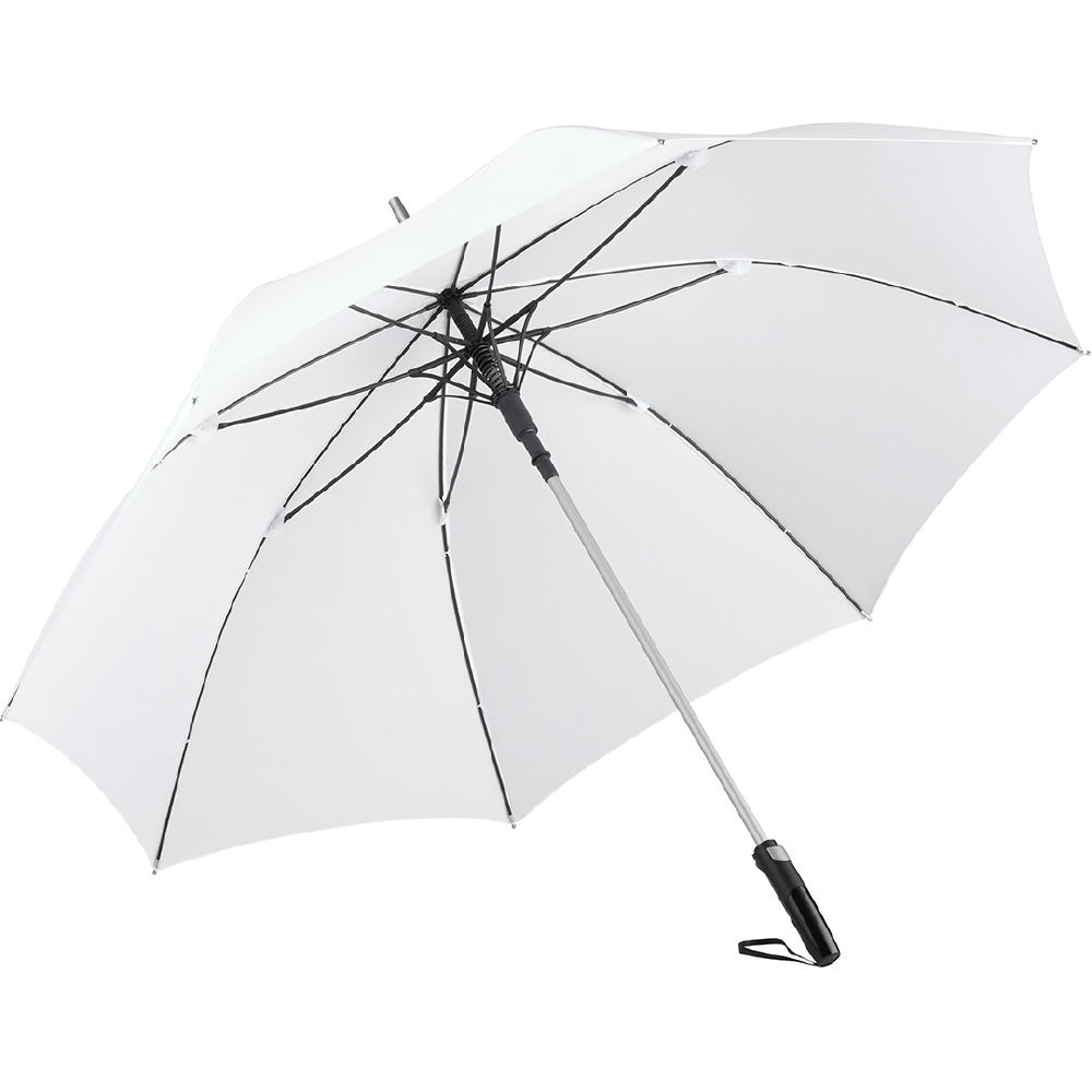 Edler Automatik-Gästeschirm für zwei Personen mit Elementen in Metallic-Farben. Komfortable Automatik-Funktion zum schnellen Öffnen, hochwertiges Windproof-PLUS-System für eine maximale Gestell-Flexibilität bei stärkeren Windböen, flexible Fiberglasschienen, Aluminiumstock in matter Metallic-Farbe, Metall-Spitzen und Metall-Druckknopf am Schließband farblich passend zum Stock, matt/glänzend abgesetzter Soft-Feel-Griff mit integrierter Auslösetaste und Werbeanbringungsmöglichkeit