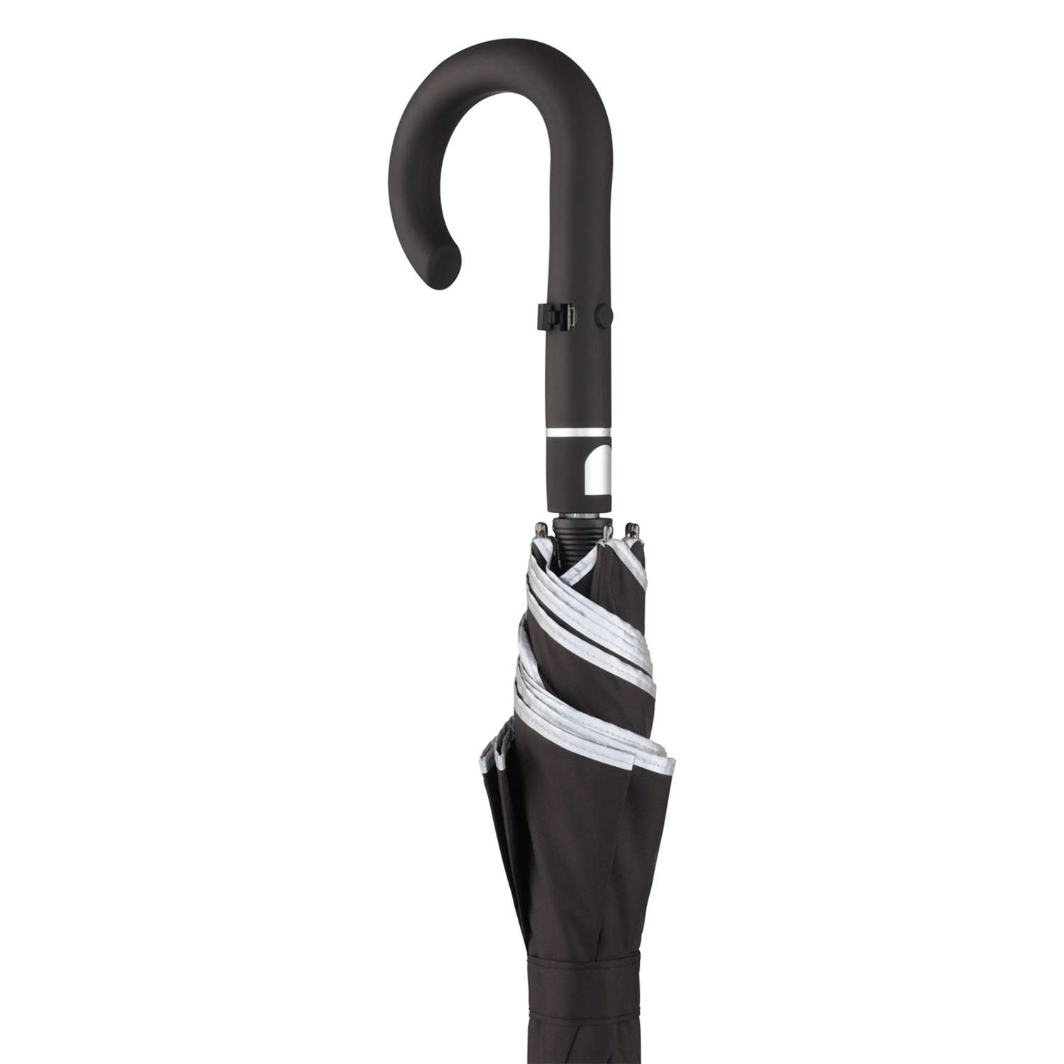 Automatik-Stockschirm in mittlerer Größe mit variabler LED-Beleuchtung. Windproof-System. Automatisch öffnend, transparenter Stock mit LED-Beleuchtung. Soft-Touch-Rundhakengriff mit integrierter silberner Auslösetaste sowie Griffring und Werbeanbringungsmöglichkeit. Micro-USB Ladeanschluss. Taste zur Auswahl der Leuchtfarbe oder Farbwechsel. Inkl. Ladekabel.