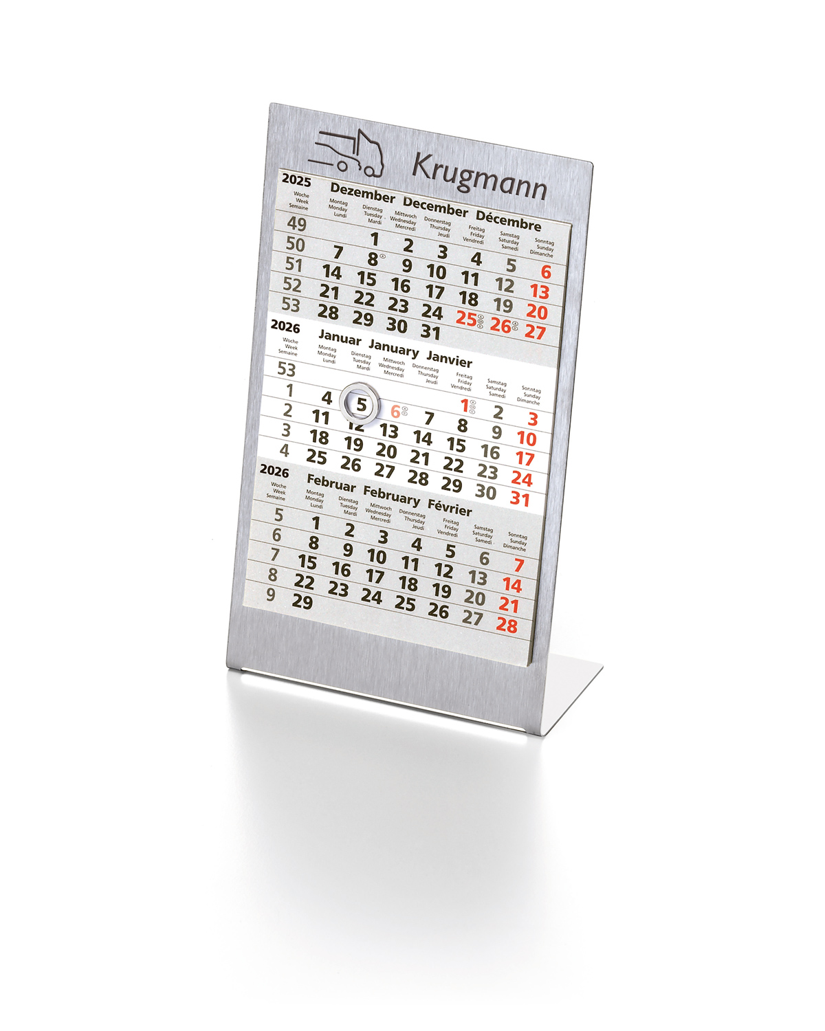 Tisch-Aufstellkalender aus gebürstetem Edelstahl in hochwertiger Optik. Kalendarium für 2 Jahre. Made in Germany.
