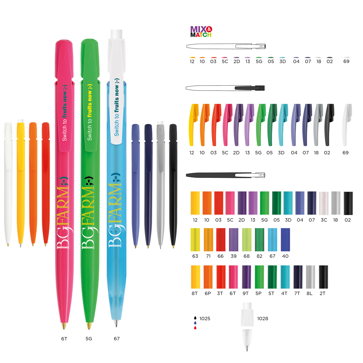 Individuelle Mix-Farbkombinationen: Clip und Plug aus verschiedenen Volltonfarben oder weiß gefrostet wählbar. Für den Schaft verschiedene Volltonfarben, gefrostete oder transparente Farben wählbar. Clip nahezu unbrechbar aus Delrin®. Preis inkl. 360°-4c-Druck mit weißer Unterlegung. Weitere Werbeanbringungen auf Anfrage.