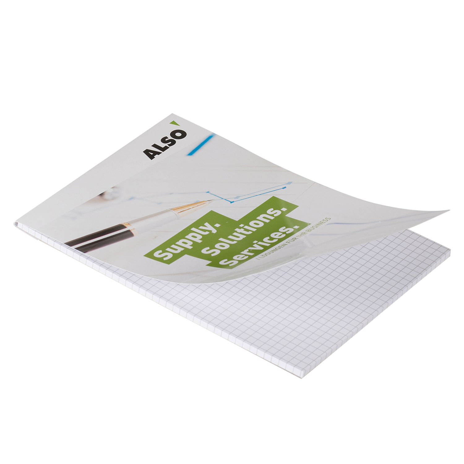 Notiz- und Schreibblock Liniert, kariert oder blanko, 50 Blatt (100 Seiten), 70 g /m2 Schreibpapier, kopfverleimt oder seitliche Verleimung, mit umlegtem Deckblatt. Maße: 14,6 x 20,8 cm. Preis ab 1.000 St. inkl. 4-farbigem Druck auf dem Deckblatt