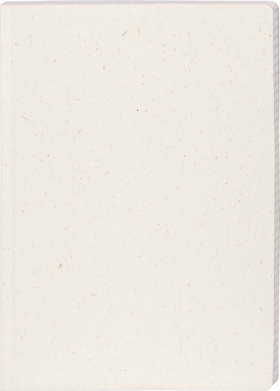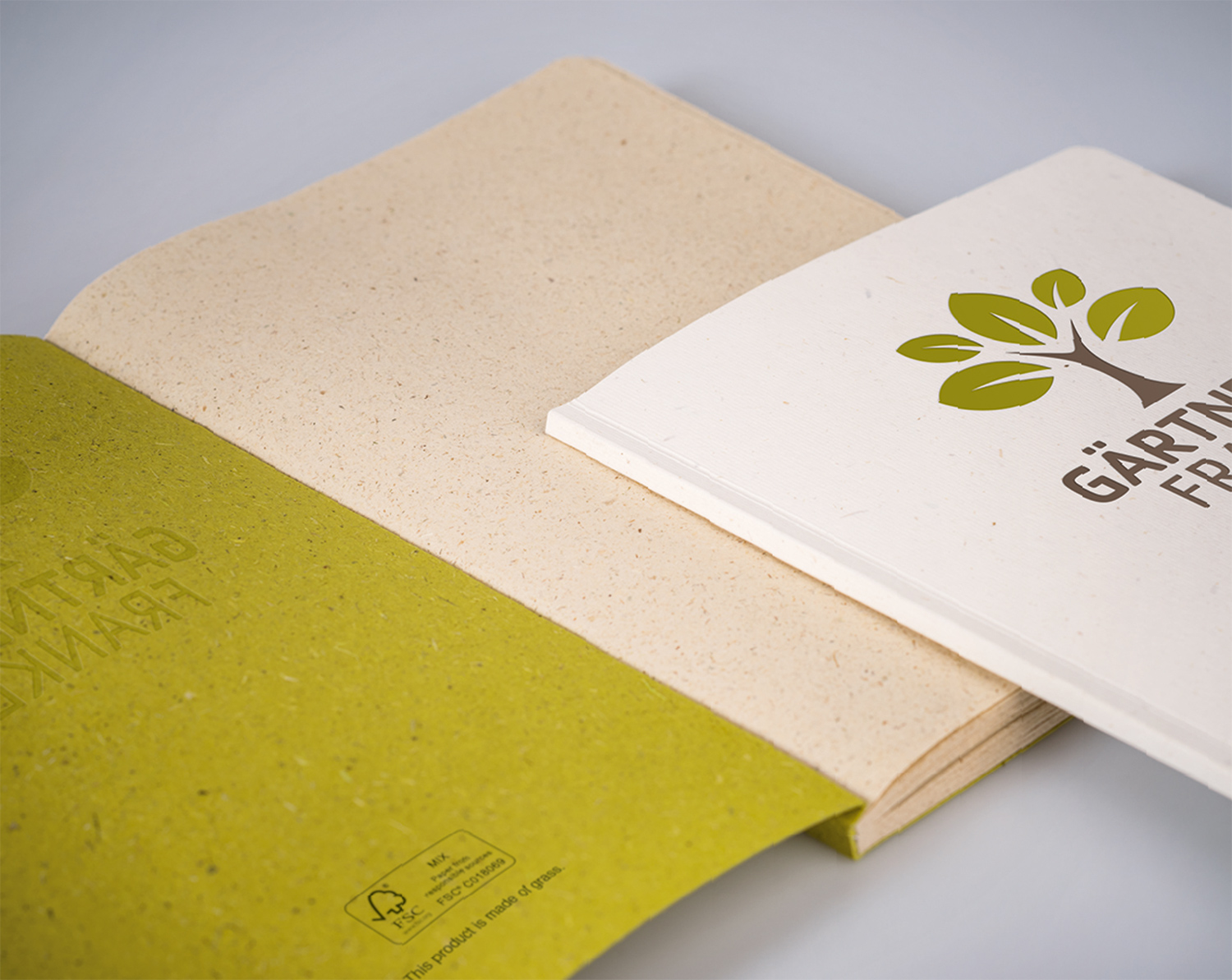 Notizheft, 96 Seiten Inhalt, mit Broschureinband aus Naturpapier in zwei Varianten. 1. Einband aus Blattgrün/Chlorophyll mit unbedrucktem Inhalt aus Graspapier oder 2. Einband aus Weizenstroh mit Inhalt aus kariertem Schreibpapier. Jeweils Umschlag und Inhalt bündig mit runden Ecken.