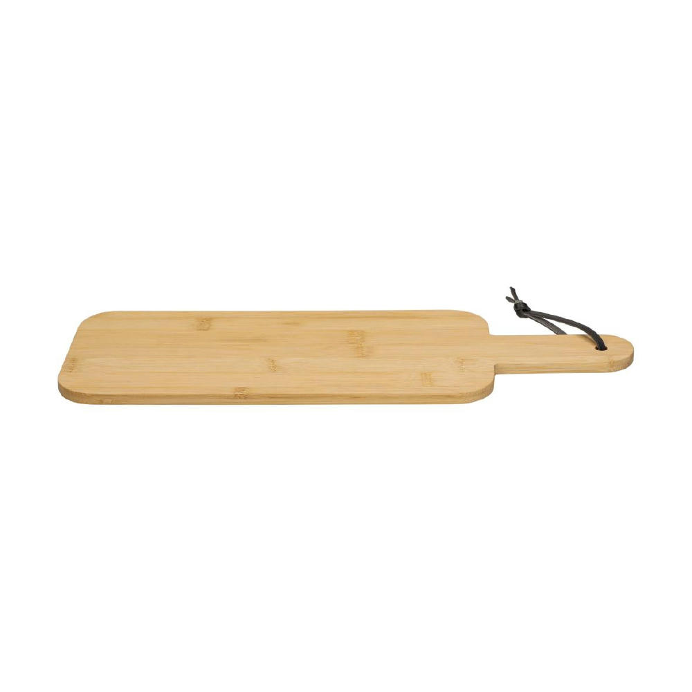 Handliche, schmale Form, aus schnittfestem und messerschonendem Bambus gefertigt. Mit hochwertiger Lederschlaufe zum Aufhängen.