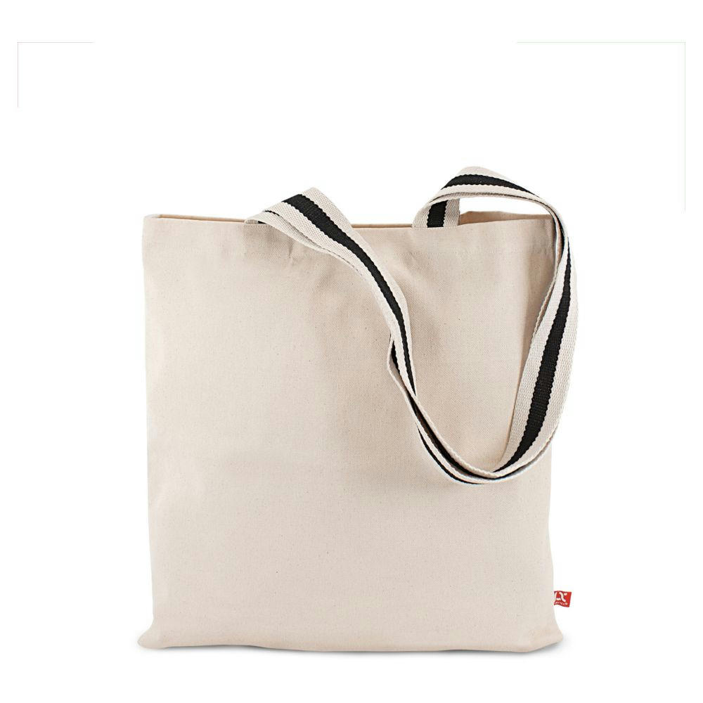 Zu 100 % aus OEKO-TEX® zertifizierter Baumwolle in strapazierfähiger Twill-Qualität mit modischen zweifarbig gewebten langen Henkeln.