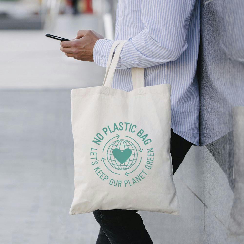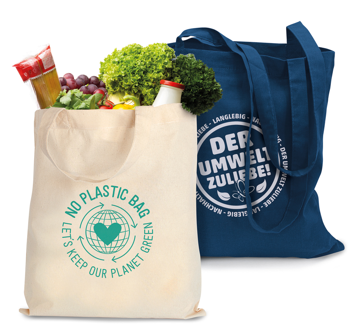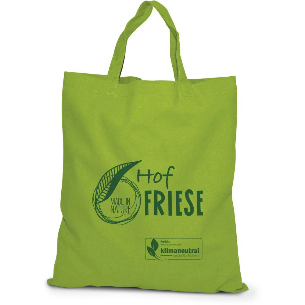 Umweltfreundliche Baumwolltasche mit kurzen im Kreuzstich vernähten Henkeln. Gegen Aufpreis auch mit langen Henkeln erhältlich.