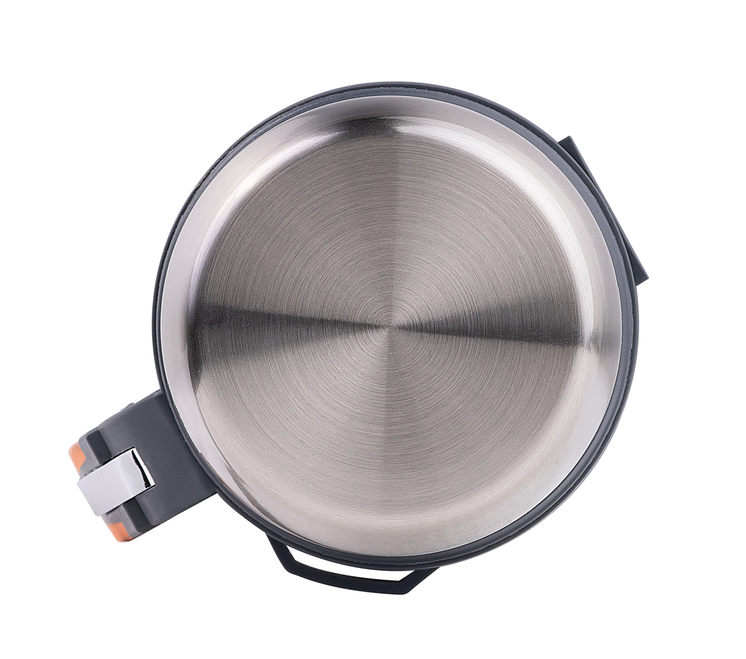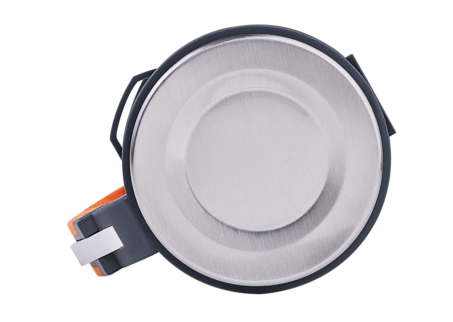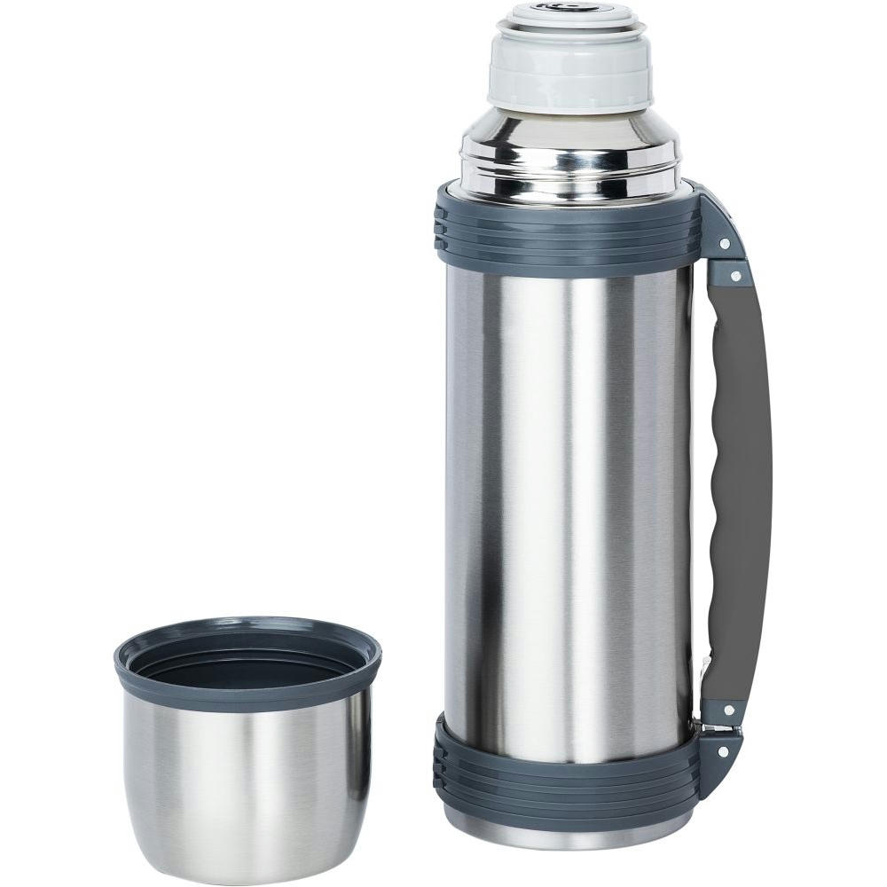 Vakuumflasche mit Schraubdeckel als Trinkbecher und stabilem Klappgriff.