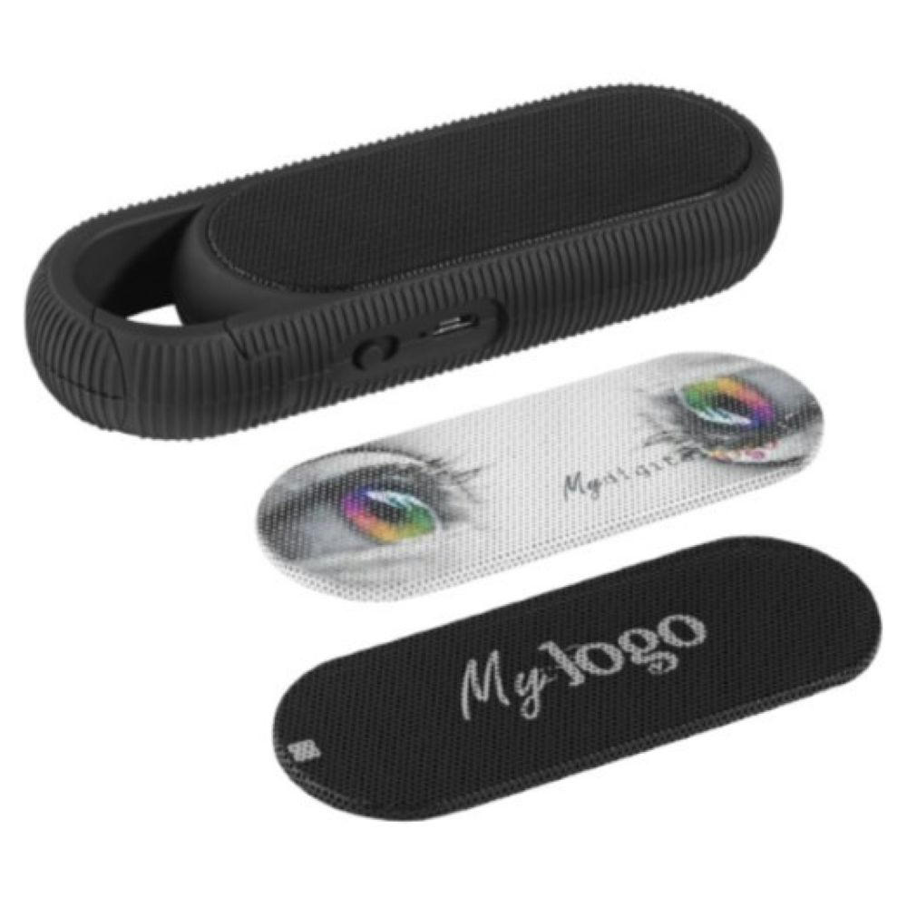 Kompakter wireless Lautsprecher mit großem Sound und Karabiner. 3W, 300mAh Lithium-Ionen-Akku, für 3-5 h Musik / 4-6h Ladezeit. USB-Kabel.