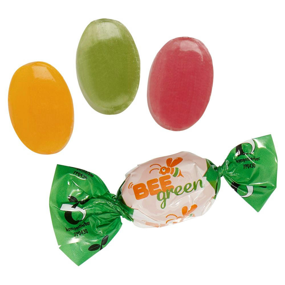 Bonbon im kompostierbaren Werbewickel aus glasklarer, alternativ weißer Folie einzeln gewickelt. Geschmack: Fruchtmischung aus Zitrone, Orange, Apfel, Kirsche und Cassis (auch sortenrein). Alternativ sortenrein: Multivitamin gefüllt, Eis oder Pfefferminz. Haltbarkeit: ca. 18 Monate. Inkl. 1–5c-Druck. Preis pro kg (ab 25 kg).