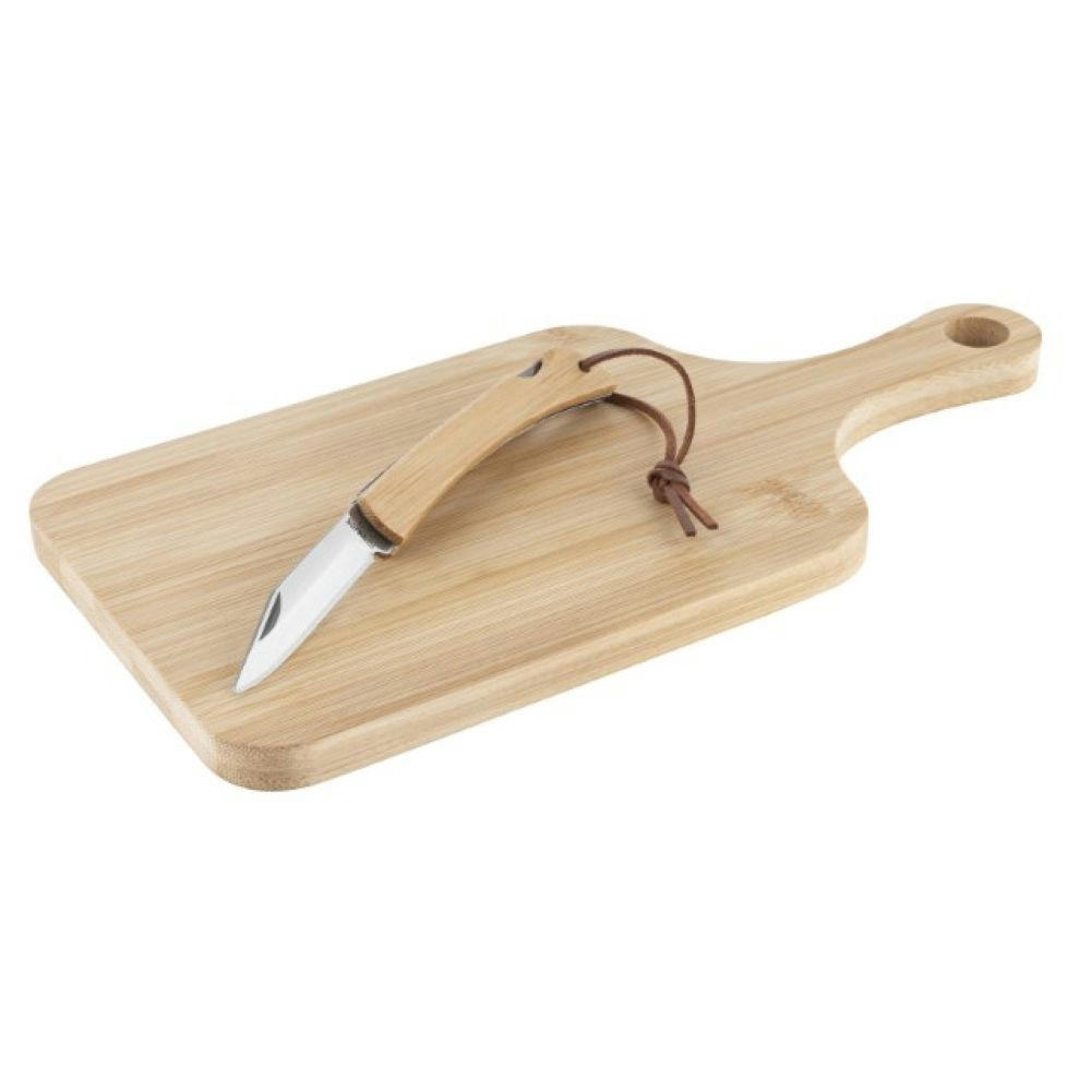 Brotzeit-Set bestehend aus Bambus Schneidbrett & Vespermesser mit Bambusgriff (Bambus ist kein Holz sondern ein CO2-reduzierendes Gras) für vollendete Mahlzeiten zuhause, im Büro und unterwegs, incl. Aufhängungsmöglichkeit. Brettchen+ Messer, LFGB Konform