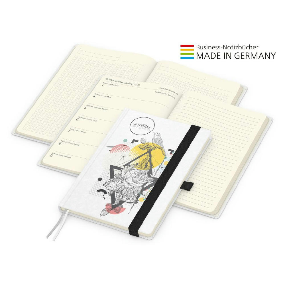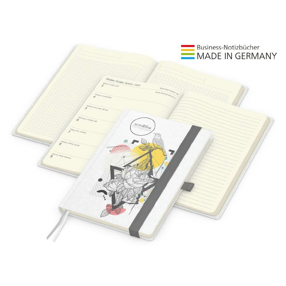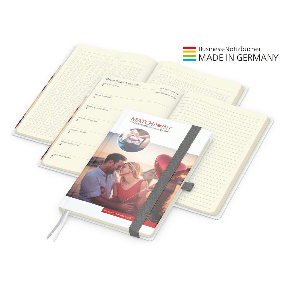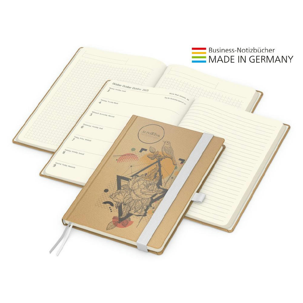 Der Hybrid-Timer für jedes Corporate Design mit cremefarbenem Inhaltspapier. Individuell bedruckter Einband kombiniert mit Gummiband und Stiftschlaufe in Wunschfarbe. Wochenkalendarium von August 2024 - Dezember 2025