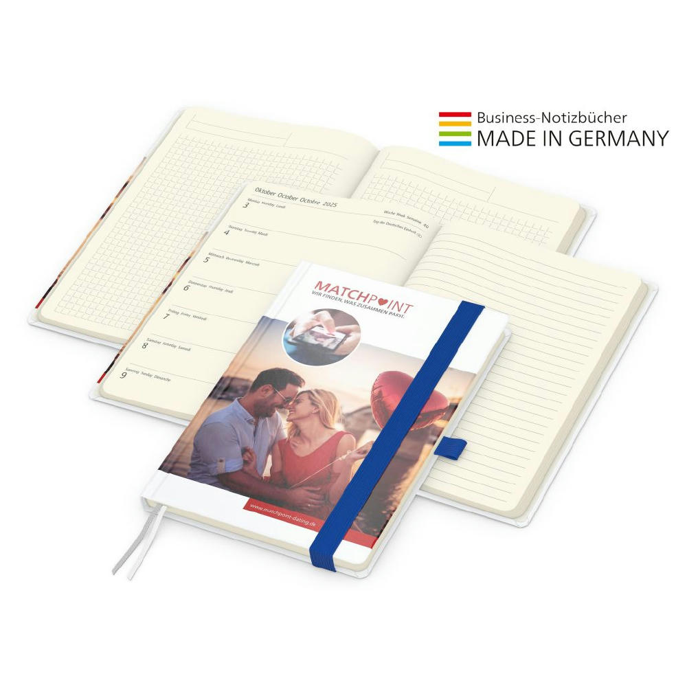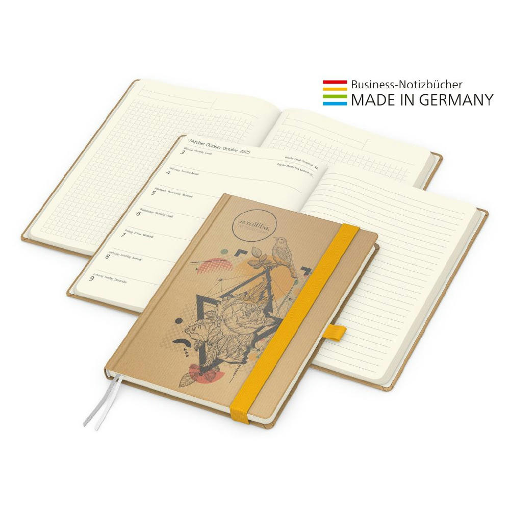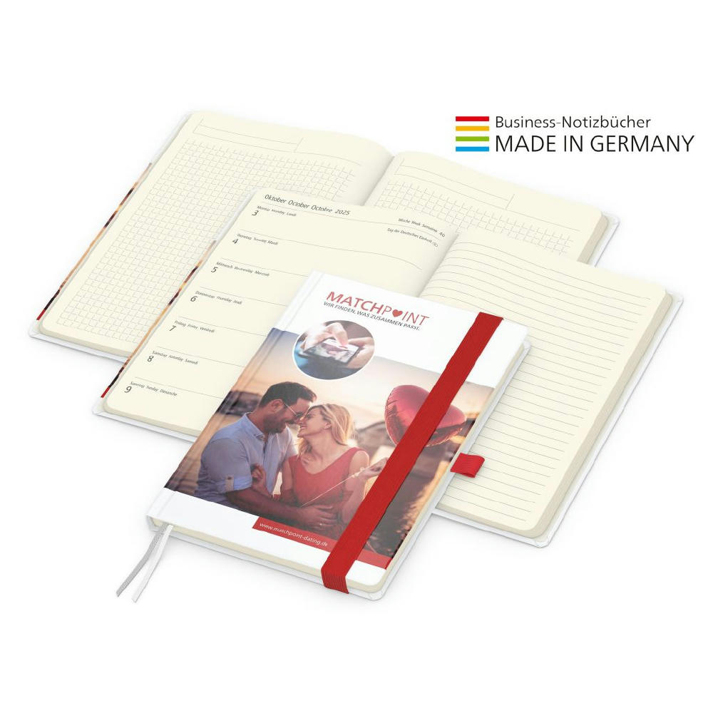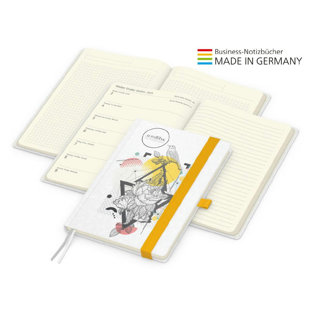 Der Hybrid-Timer für jedes Corporate Design mit cremefarbenem Inhaltspapier. Individuell bedruckter Einband kombiniert mit Gummiband und Stiftschlaufe in Wunschfarbe. Wochenkalendarium von August 2024 - Dezember 2025