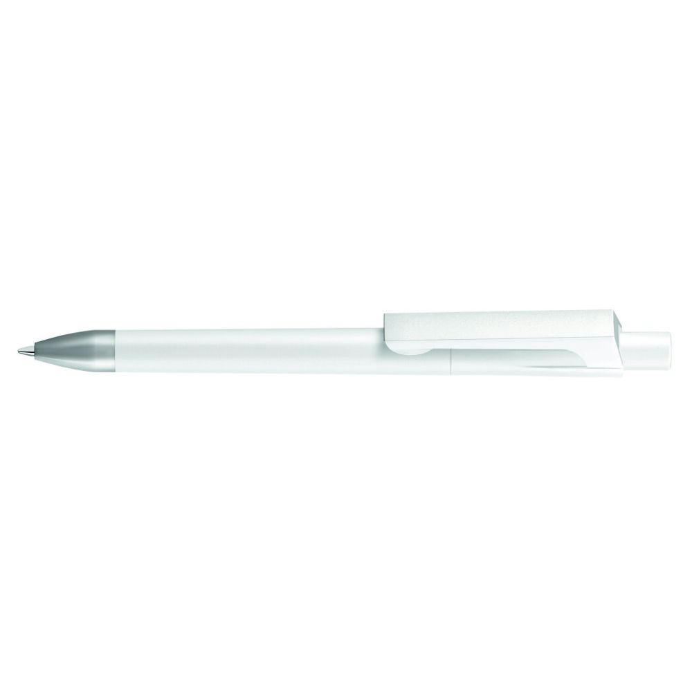Druckkugelschreiber mit gedeckt mattem Gehäuse und schwerer Metallspitze matt verchromt.