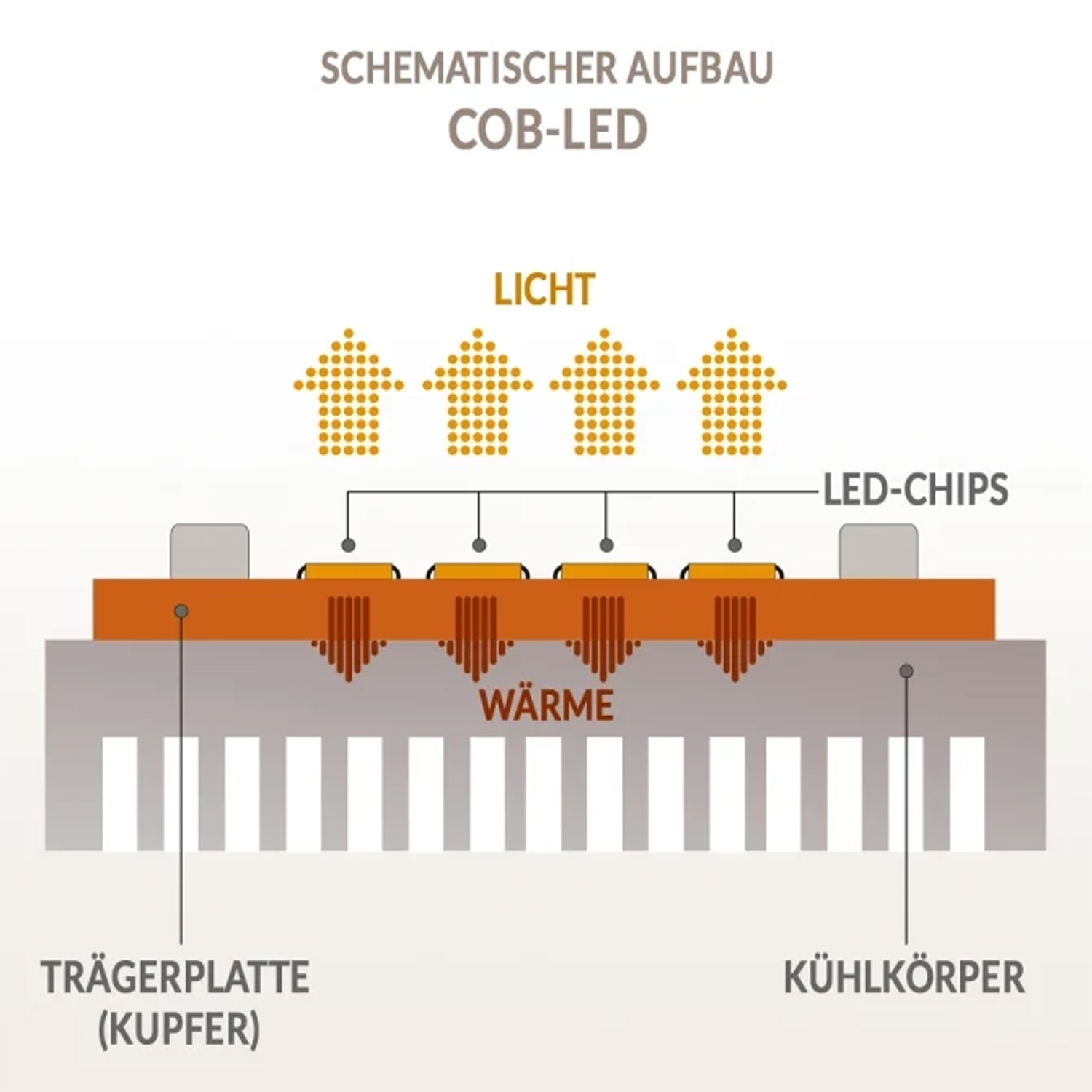 "COB" steht für "Chip on Board" und beschreibt eine neue Technologie zur Bestückung von LED-Lichtquellen. COB-Module sind sehr flach, platz- und energiesparend: Zahlreiche LED-Chips werden auf engstem Raum auf eine hochleitende Trägerplatte (Board) aufgebracht und erzeugen im Verbund hohe Lichtströme mit einer gleichmäßig leuchtenden Fläche. COB-LEDs sind dadurch wesentlich effizienter und langlebiger als herkömmliche LEDs.