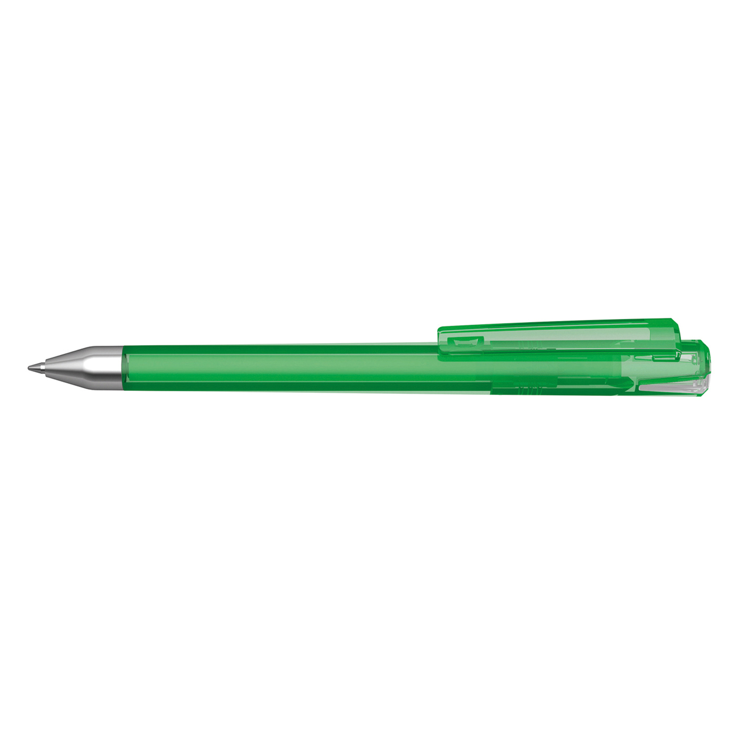 Drehkugelschreiber mit transparent glänzendem Gehäuse und Oberteil mit zwei farbigen Stopfen in gedeckt oder transparent glänzend. Schwere Metallspitze glanzverchromt.