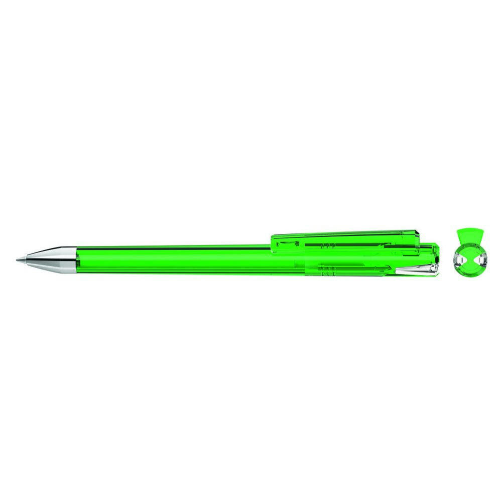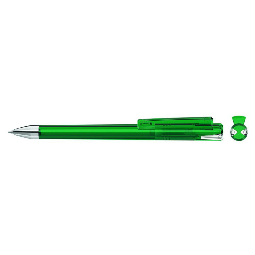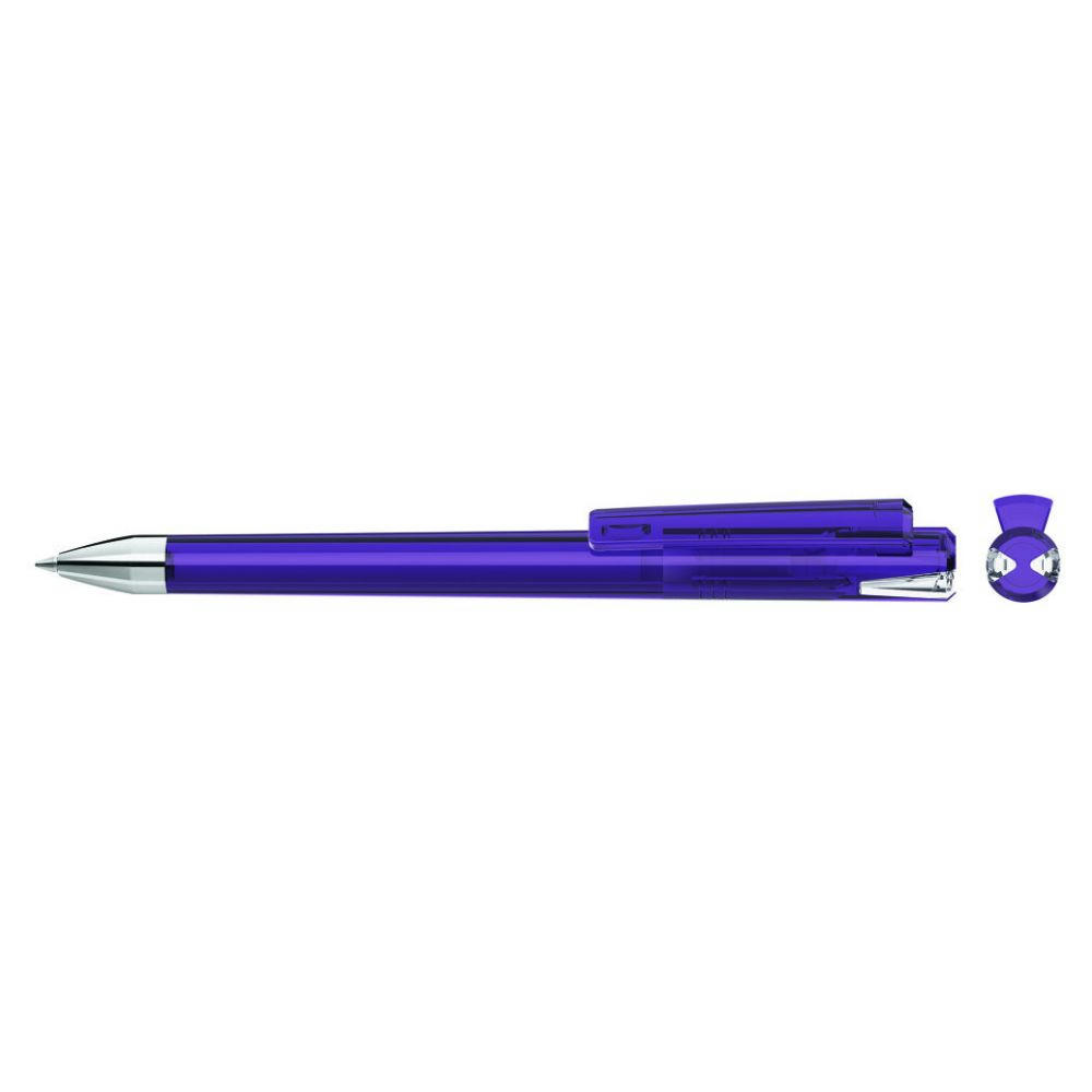 Drehkugelschreiber mit transparent glänzendem Gehäuse und Oberteil mit zwei farbigen Stopfen in gedeckt oder transparent glänzend. Schwere Metallspitze glanzverchromt.