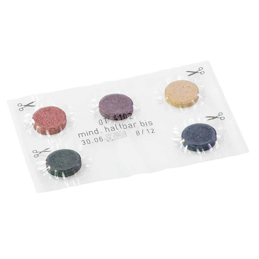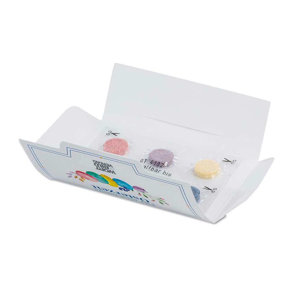 Eieiei: Das Briefchen mit 5 Farbtabletten zum Eierfärben kann schon ab 500 Stück individuell gestaltet werden - ein bunter Auftritt, der Ihre Zielgruppe aktiviert! Made in germany.