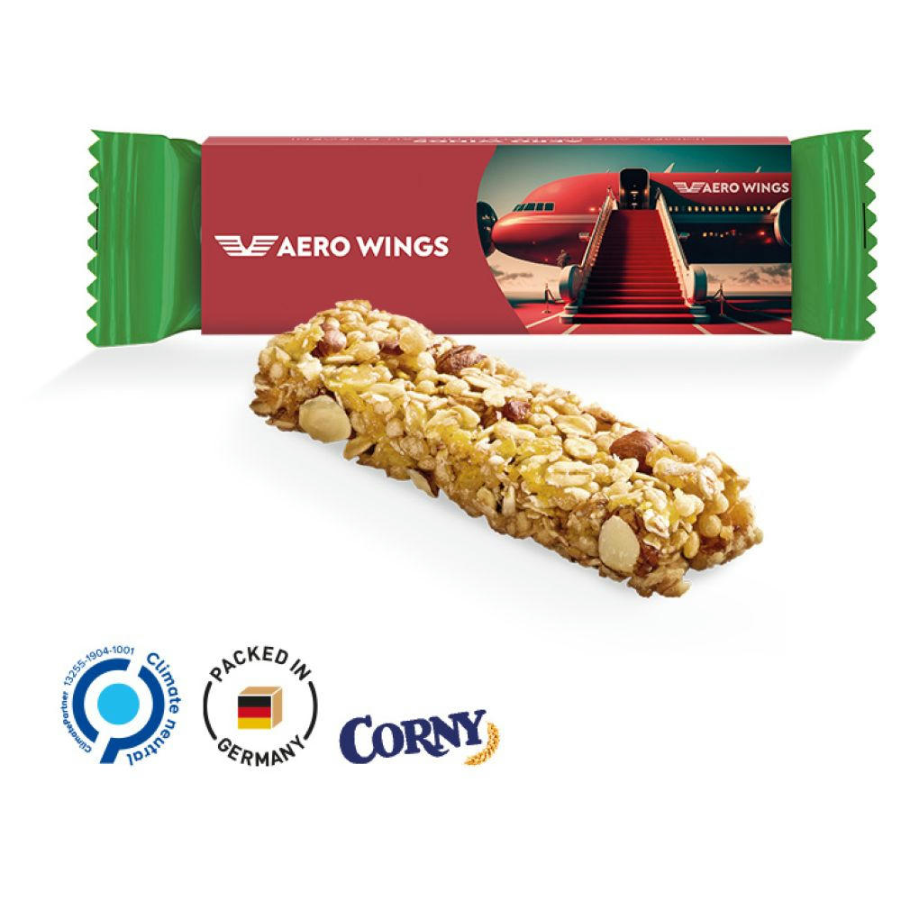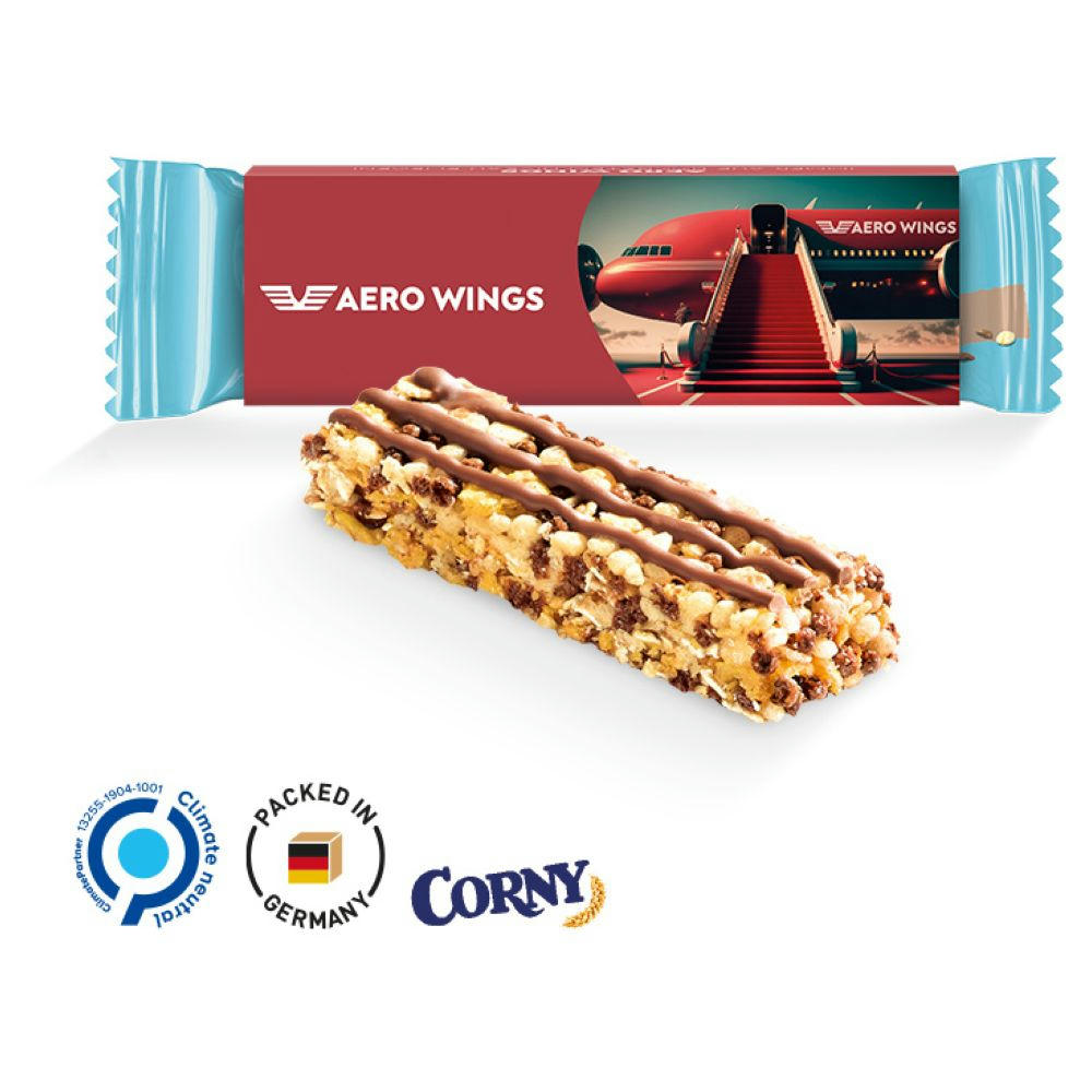 Corny Müsliriegel im Werbeschuber aus weißem Karton, individuell bedruckt. Inhalt: Corny Müsliriegel Schoko, 25 g