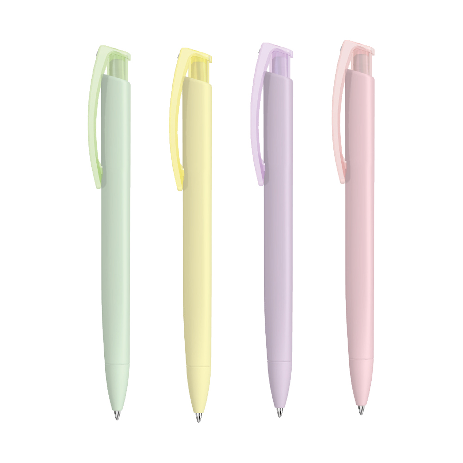 Druckkugelschreiber mit gummierten Gehäuse in 5 frischen Pastell-Farben. Mit transparent glänzendem Clip. Auswechselbare, blaue Großraummine.