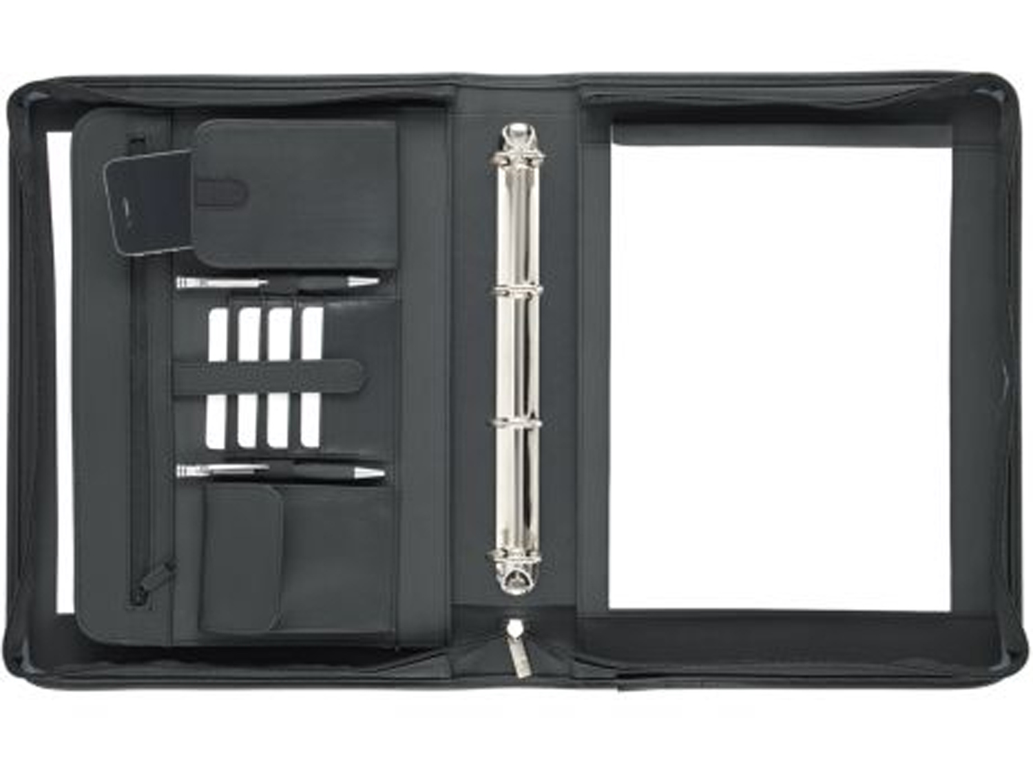 Mit Tragegriff und herausnehmbarer D-Mechanik, Füllhöhe 3 cm. Palm-, Karten-, Reißverschluss- und großes Faltenfach, Steckfach außen, Stiftschlaufen, inkl. Block. Material: lederähnliches Softana Material. Farbe: schwarz. Maße: 38 x 31 x 6 cm, Gewicht: 1.570 g