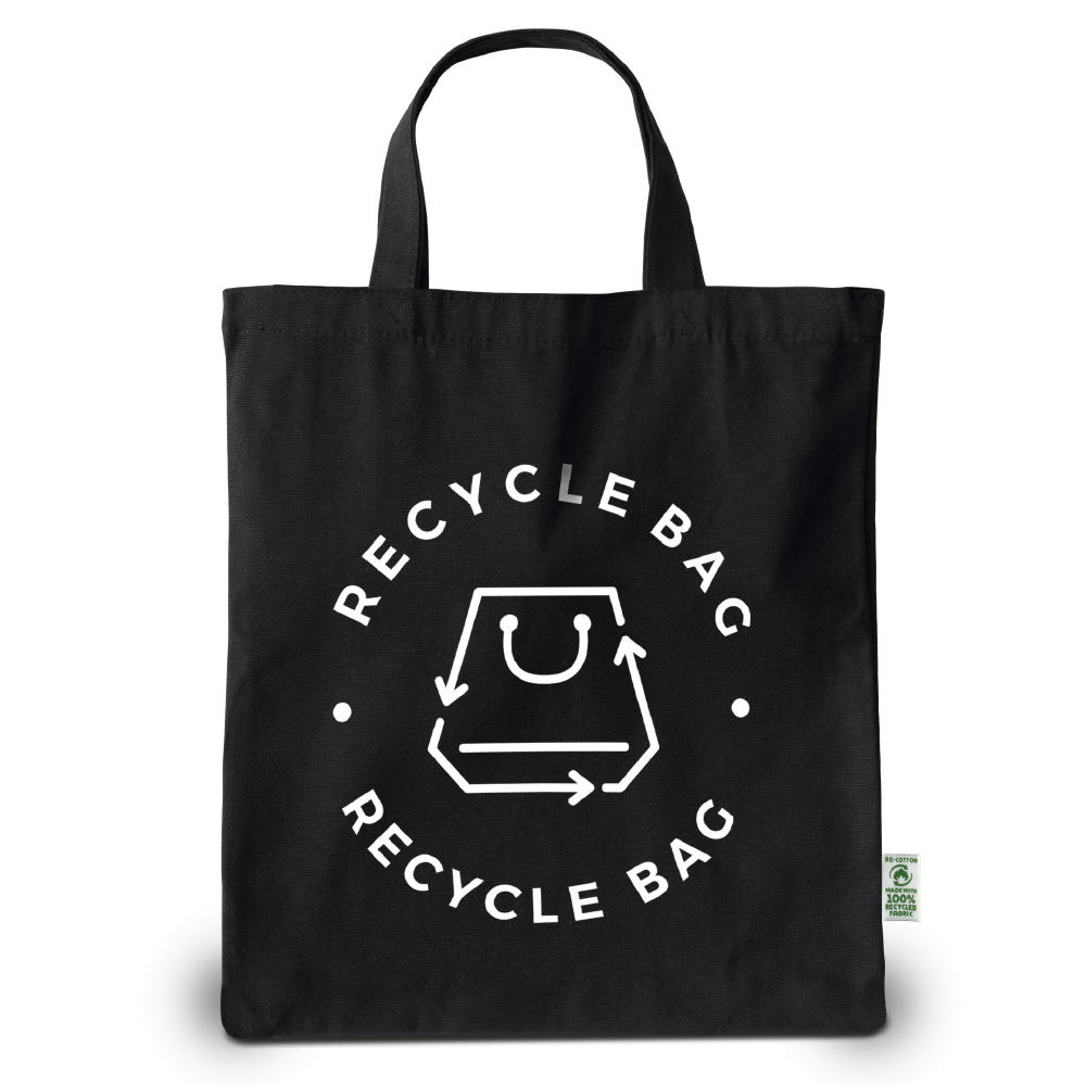 Tasche aus recycelter schwerer Baumwolle mit kurzen im Kreuzstich vernähten Henkeln und RE-cotton label aussen. Gegen Aufpreis auch mit langen Henkeln erhältlich.