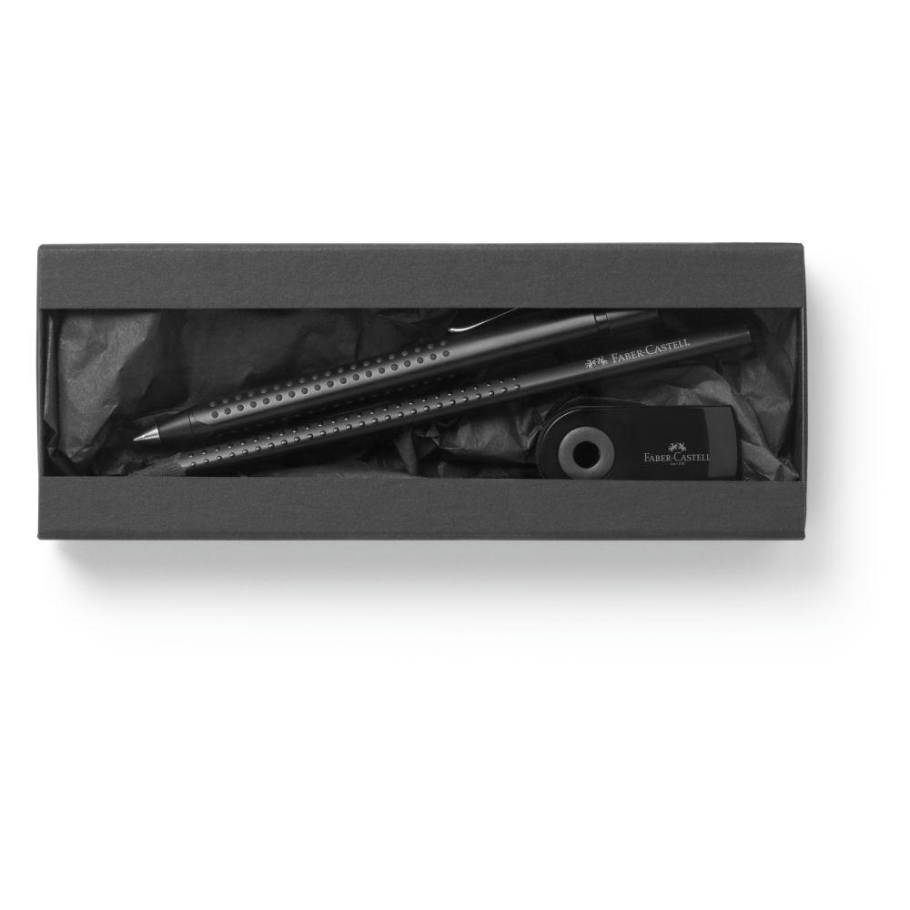 Attraktive Kombination des Kugelschreibers GRIP 2011 (schwarz-matt), des Design-Bleistiftes GRIP 2001 (schwarz durchgefärbtes Holz) sowie des Radierers Sleeve Mini. Alle Teile in edlem Schwarz. Zusammen eingelegt auf Seidenpapier in Geschenkverpackung mit