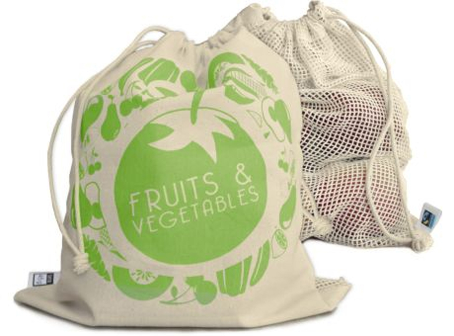 Baumwollbeutel für Obst und Gemüse. FairTrade, Öko-Tex 100, Vorderseite aus Baumwolle zum Bedrucken, Rückseite aus Baumwollnetz für Sichtbarkeit der Ware.