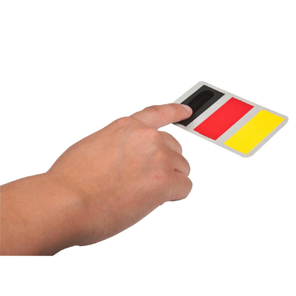 Tolles Schmink-Accessoire für alle Deutschland-Fans. Leichte, flache Karte mit schwarzer, roter und gelber Farbe zum Auftragen auf die Haut. Einfach mit dem angefeuchteten Finger die Farbe aufnehmen und nach Belieben schminken. Inkl. Anleitung und Werbefläche auf der Rückseite. Verpackt im transparenten Polybeutel.