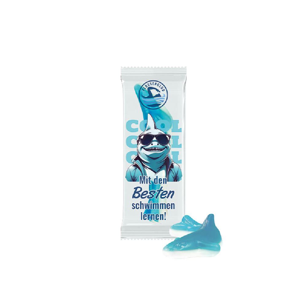 Flowpack aus transparenter Folie, individuell bedruckt. Inhalt: 1 Trolli Fruchtgummi "Haifisch" blau, mit weißem Schaumzuckerbauch, 8g, Sonderfarben und -geschmacksrichtungen ab 50.000 Stück auf Anfrage. Inkl. 1-4c-Druck.