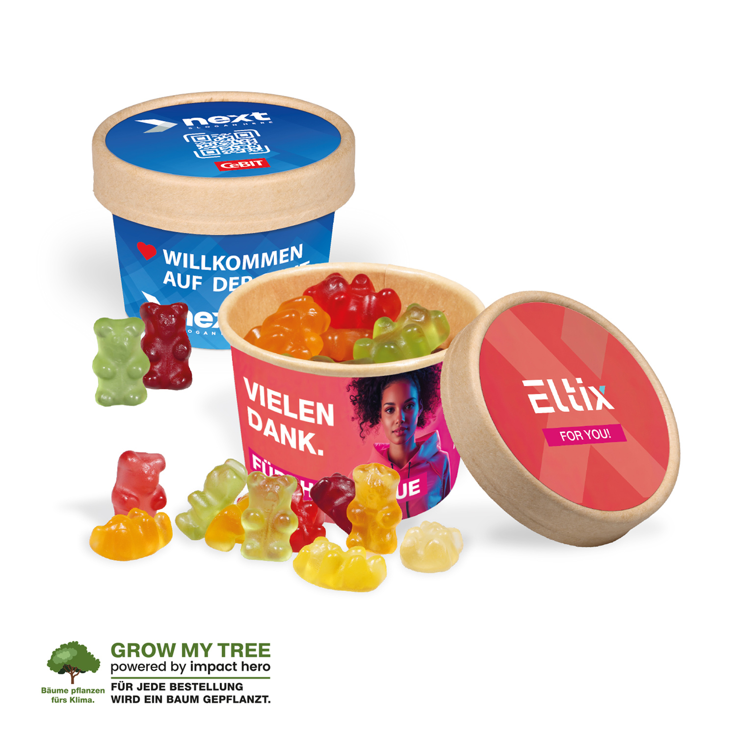 Premium Fruchtgummi-Bärchen mit Fruchtsaftgehalt durch Fruchtsaftkonzentrat. Gluten- und laktosefrei. Geschmacksrichtungen: Apfel, Zitrone, Orange, Himbeere, Ananas, schw. Johannisbeere. Im wiederverschließbaren Kartonbecher mit Frischesiegel. Der Einleger im Deckel und die Banderole sind individuell bedruckbar. Inkl. 4c-Druck. Für jede Bestellung wird ein Baum über GROW MY TREE gepflanzt.