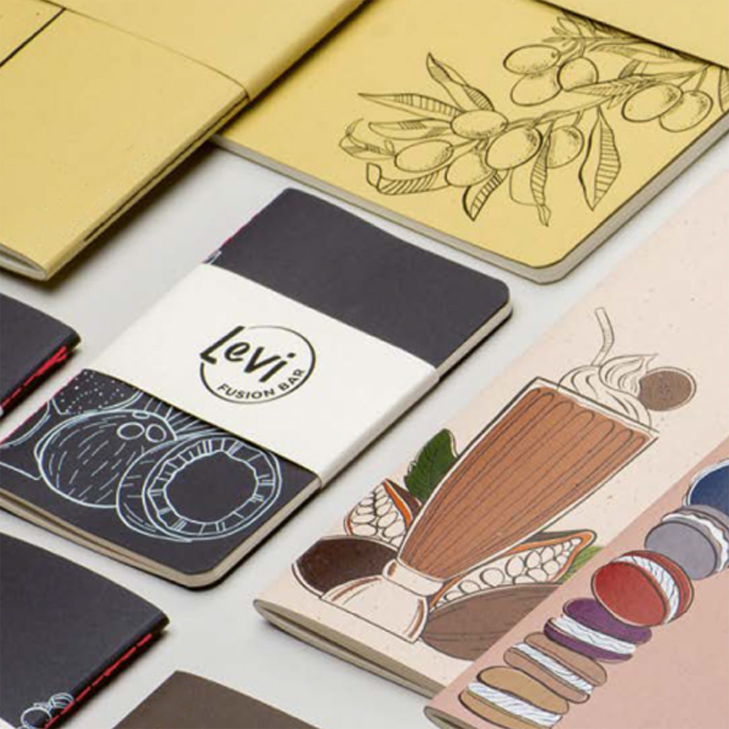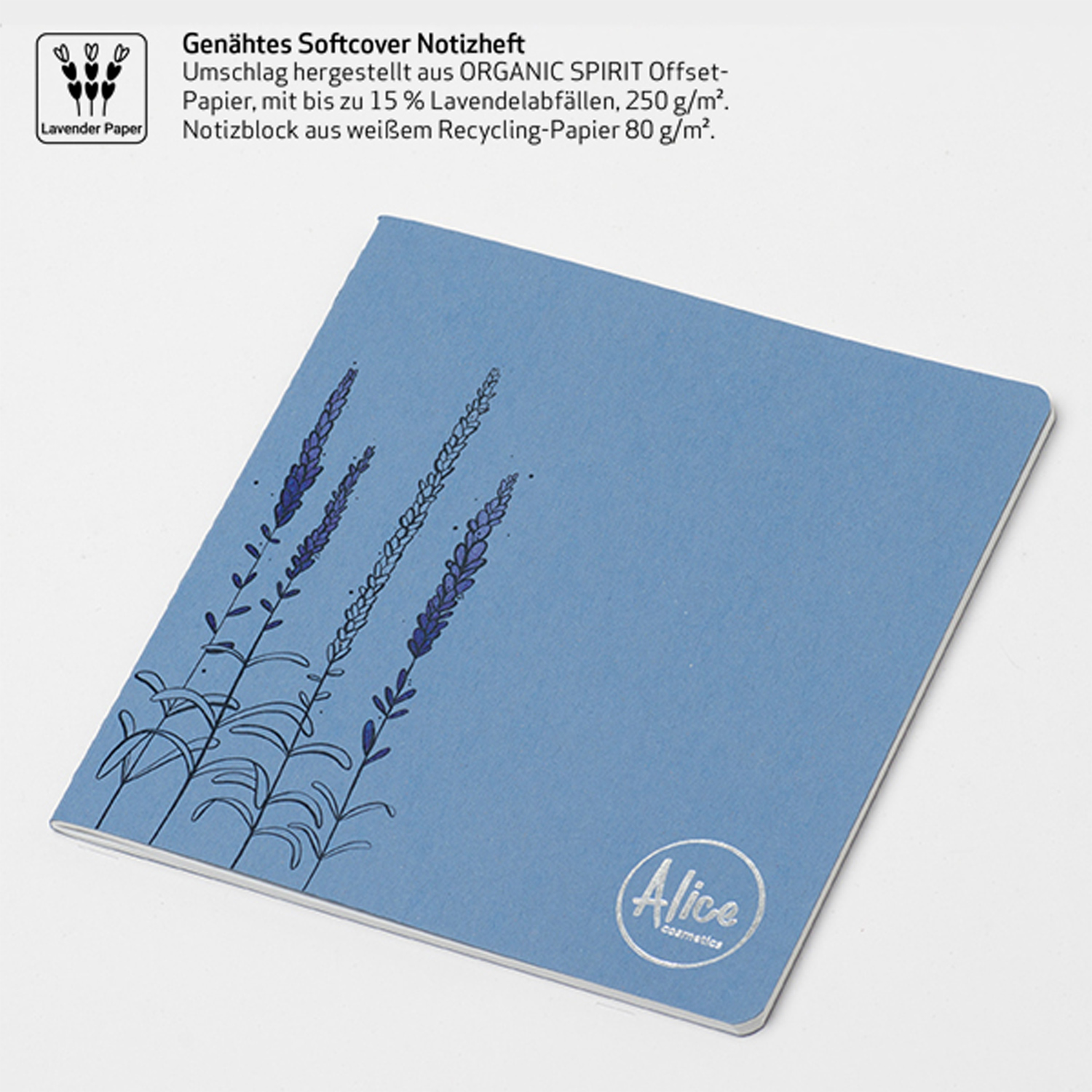 Die mit Faden genähten Notizhefte sind eine einzigartige und minimalistische Wahl für umweltbewusste Unternehmen und Marken. Der weiche Umschlag wird aus zertifiziertem "Organic Spirit"-Papier hergestellt, in dem ca. 15% der Zellulosemasse durch Abfälle pflanzlichen Ursprungs ersetzt werden. Zusätzlich enthält das Papier 40% Zellulose aus recyceltem Verpackungsmaterial und ist vollständig biologisch abbaubar und recycelbar. Die Herstellung der Organic Spirit Notizhefte basiert auf Nebenprodukten aus der Verarbeitung von Pflanzenabfällen wie Lavendel, Kaffee, Kirschen und Oliven, was jedem Produkt eine individuelle, natürliche Farbgebung verleiht. Zahlreiche Individualisierungsoptionen ermöglichen es Ihnen, Ihr nachhaltiges Notizheft frei nach Ihren Wünschen zu gestalten. Individualisierungsmöglichkeiten: Format, Einbandfarbe (Lavendel, Kaffee, Olive u.v.m), Papierart, Fadenfarbe, Werbeanbringung (Druck, Tief- oder Hochprägung).
