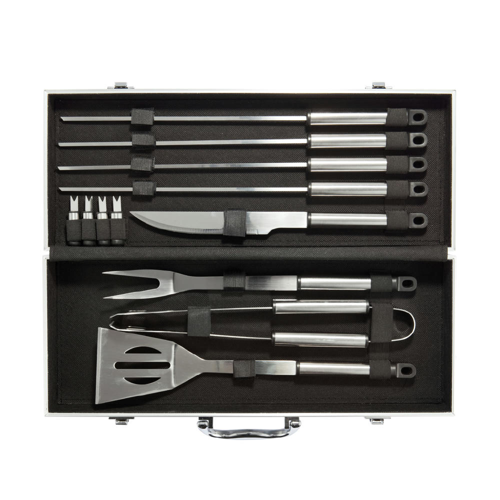 12-teilig, Aluminiumkoffer, BBQ, Bratenheber, Edelstahl, Grillgabel, Grillzange, Grillzubehör, Maiskolbenhalter, Messer, Outdoor, Spieße, grillen, set