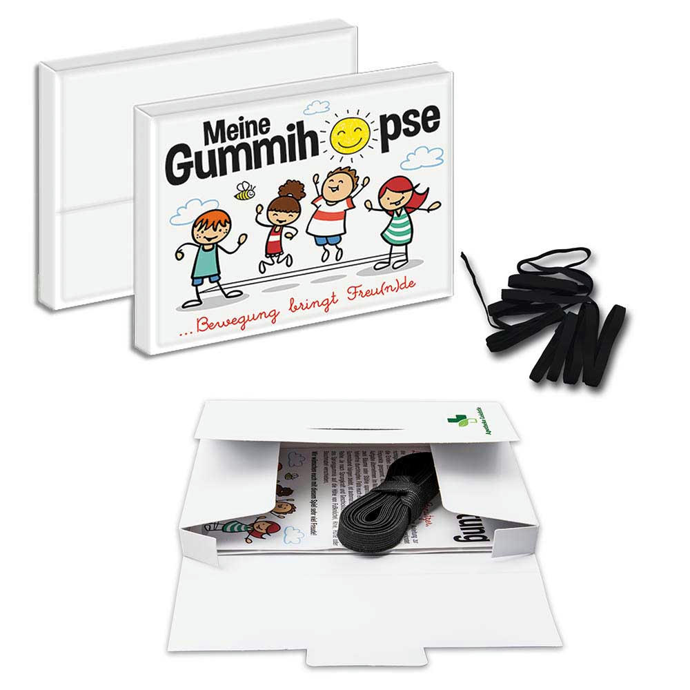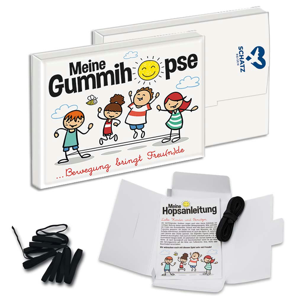Erleben Sie den Klassiker aus der Kindheit neu! Mit dem Gummitwist (auch Gummihopse genannt) bringen wir ein spaßiges und aktives Spiel zurück. Das Set enthält ein Gummiband sowie eine Spielanleitung, die Kindern und Erwachsenen zeigt, wie man mit diesem einfachen Spiel viel Freude haben kann und in Bewegung bleibt. Die Lieferung erfolgt in einer ansprechend gestalteten Mappe.