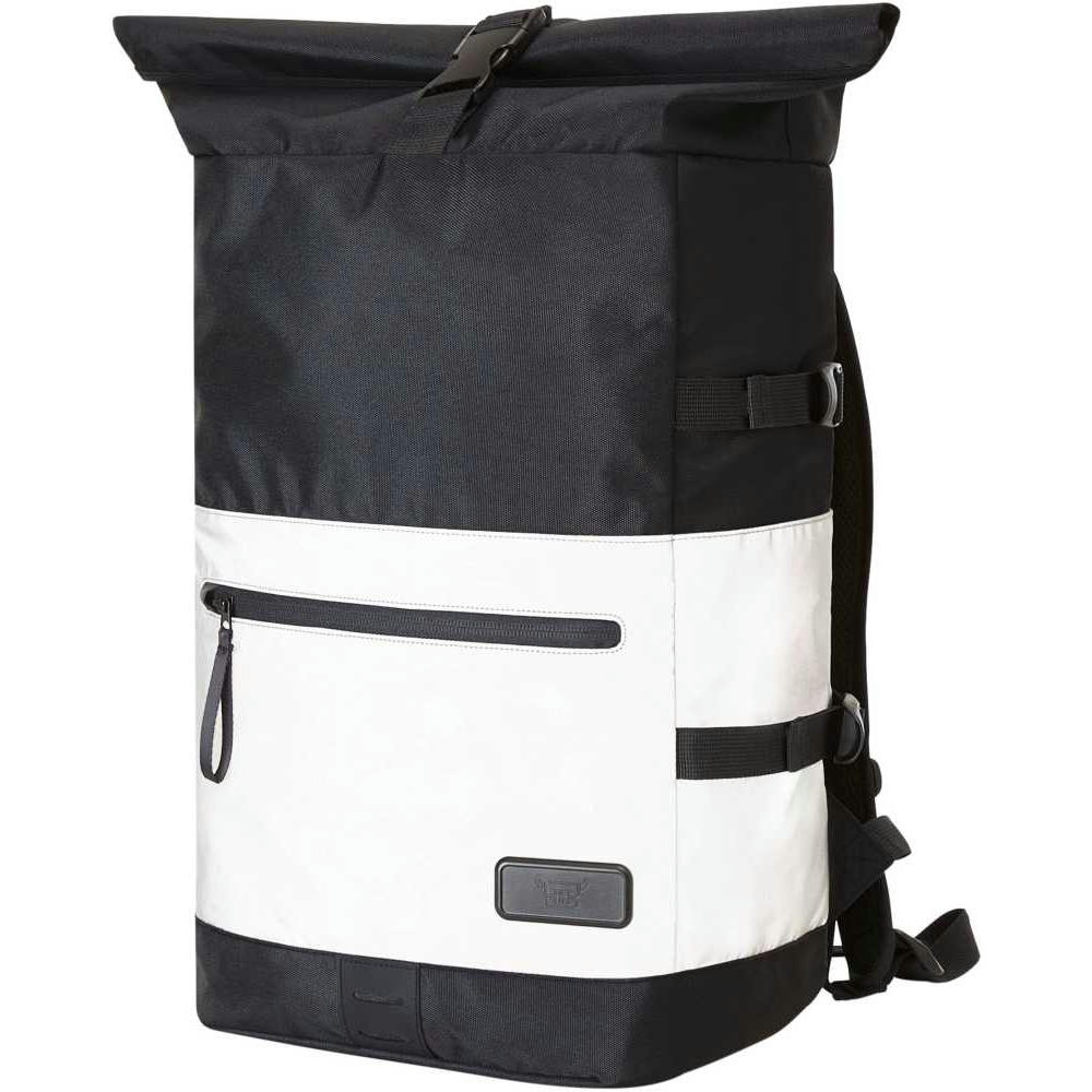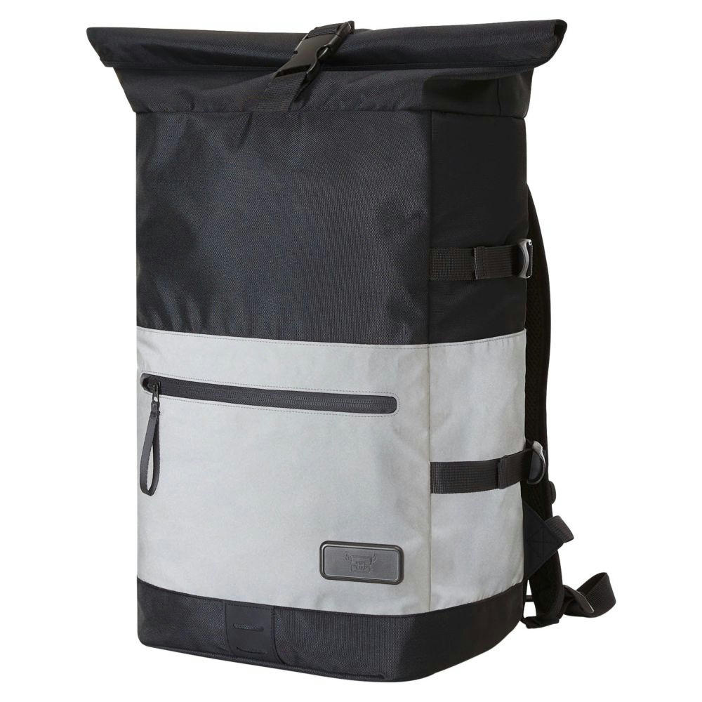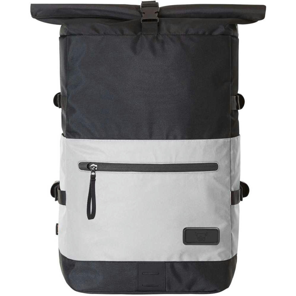 Refektierender Rolltop-Rucksack mit Reißverschluss-Hauptfach und Steckverschluss; HFL®-Träger für Ihr Logo; gepolstertes Einsteckfach und Reißverschluss-Netzfach innen; zwei seitliche Einsteckfächer; Fixiergurte; Reißverschluss-Vortasche; LED-Fahrradlicht-Befestigungsmöglichkeit; rückseitige Befestigungsschlaufe für Trolley-Gestänge; verstecktes Reißverschluss-Fach; gepolstertes Tragesystem mit höhenverstellbarem Brustgurt; Handgriff.