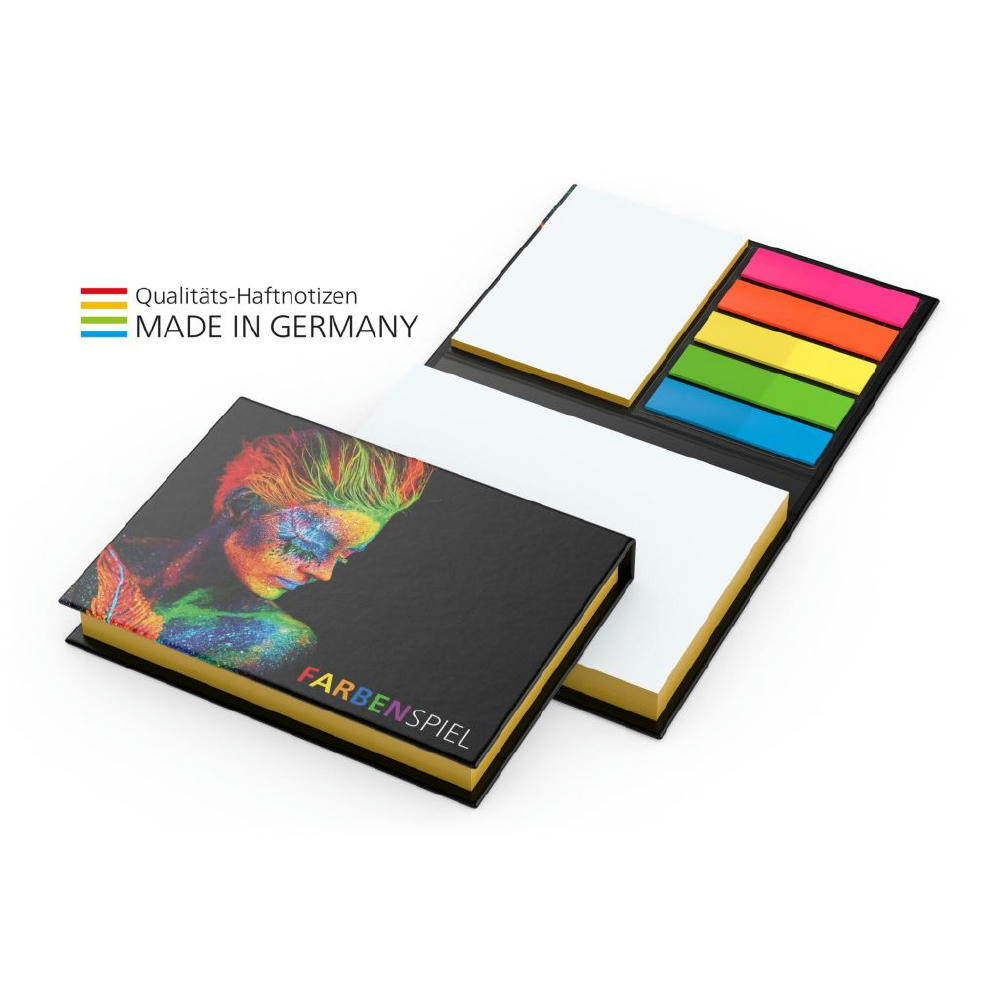 Farbschnitt: Kanten beider Haftnotizblocks in gelb, grün, mittelblau, orange rot oder schwarz bedruckt