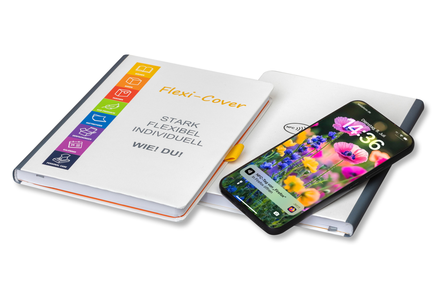 Cover aus 330 g Karton kaschiert mit Bilderdruckpapier 135 g – Druck 4/0c, Ecken abgerundet.96 Blatt - 80 g- inkl. Druck 1/1c (Linien, Karos oder Punkte, etc). PUR gebunden, inkl. Lesezeichen. Einzeln mit Papierbanderole verschlossen. Weitere Ausstattungen – gegen Aufpreis: Schlaufe für SG + Froschtasche hinten, Gummibandverschluss, Anti-Scratch-Lamination (empfohlen bei vollflächigen Druck in dunkler Farbe mit matter Kaschierung), Softouch, Druck auf Innenspiegel – vorne + hinten sowie integriertem NFC-Chip um digitale Inhalte zu entdecken.