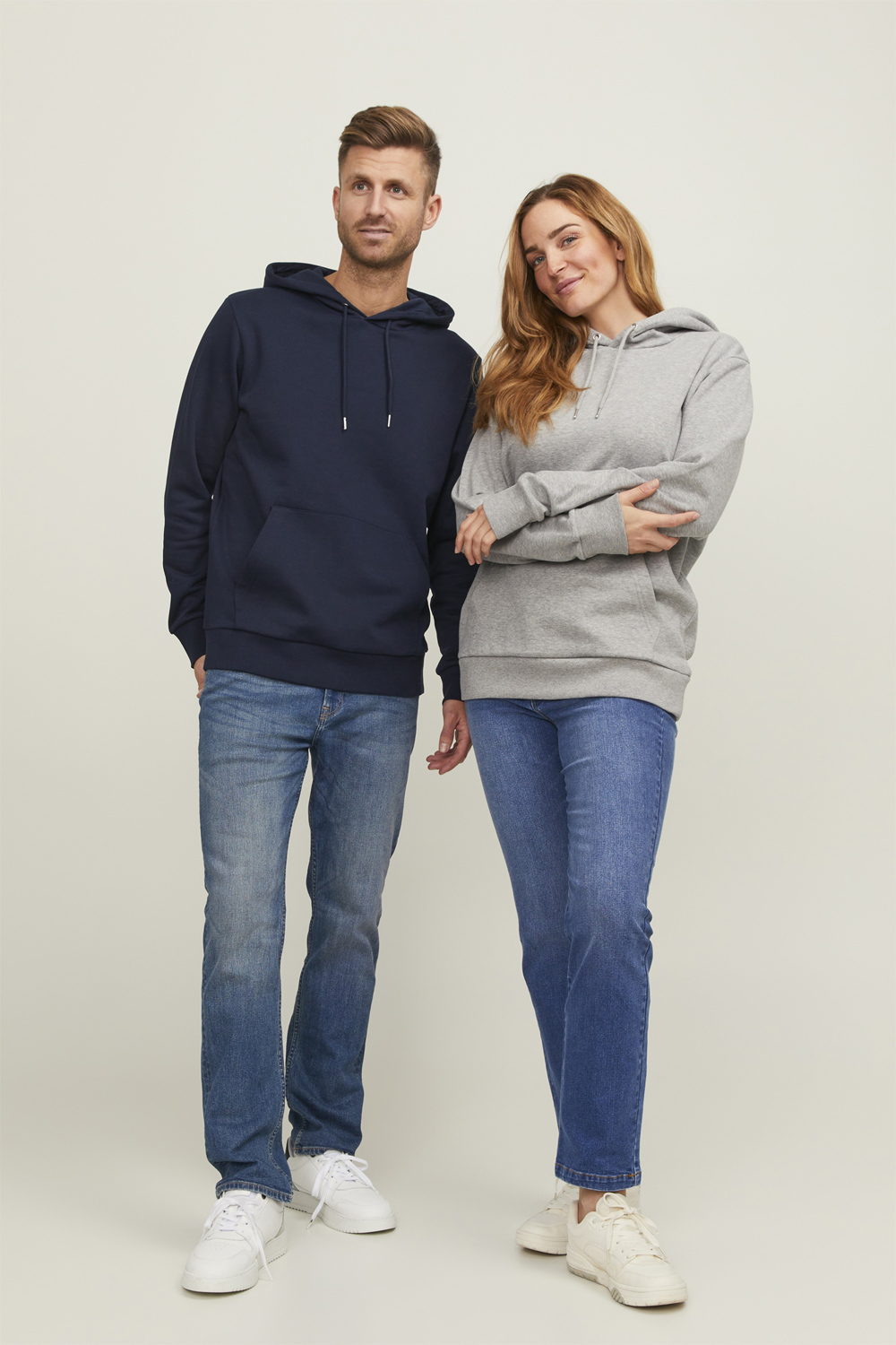 Klassischer Schnitt, gefütterte Kapuze mit Kordel mit Metallenden, Halbmond im Nacken, Rippstrickbündchen an Ärmel und Saum, Kängurutasche, innen angeraut.