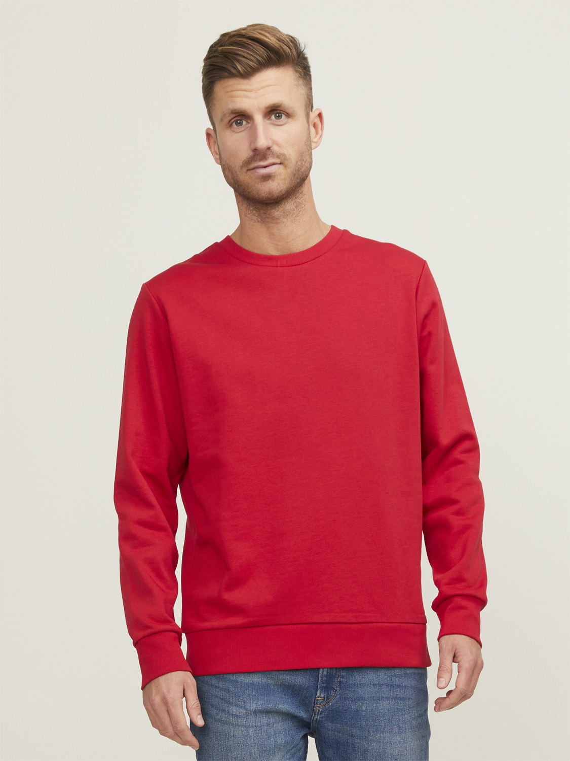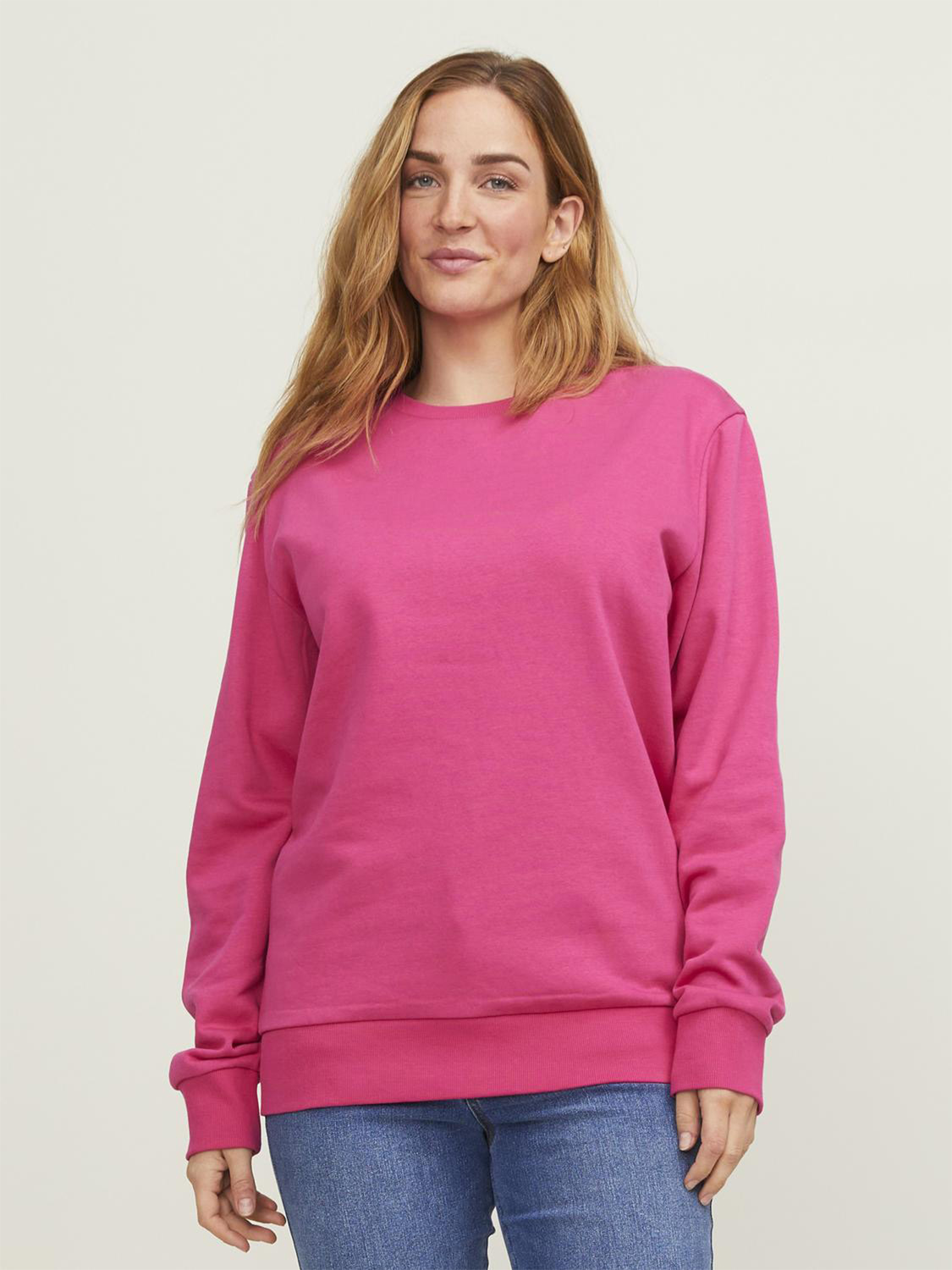 Klassischer Schnitt, breiter Rundhalsausschnitt, Halbmond im Nacken, Rippstrickbündchen an Ärmel und Saum, innen angeraut.