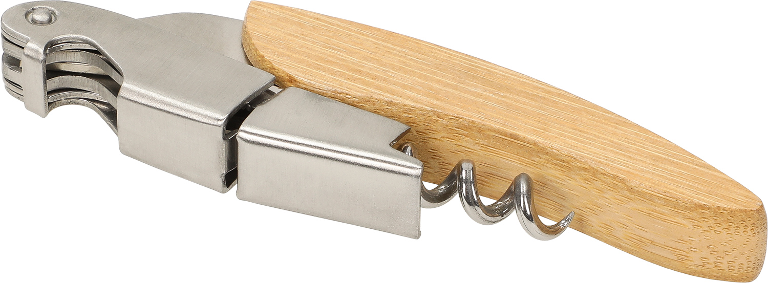 Das Kellnermesser kombiniert Bambus und Edelstahl für eine elegante und langlebige Ausführung. Es vereint Flaschenöffner und einen Kapselschneider in einem Produkt. Der spiralförmige Korkenzieher mit Hebelmechanismus ermöglicht ein einfaches und kraftsparendes Entkorken. Dieses funktionale Werkzeug ist ideal für Weinliebhaber und Profis.