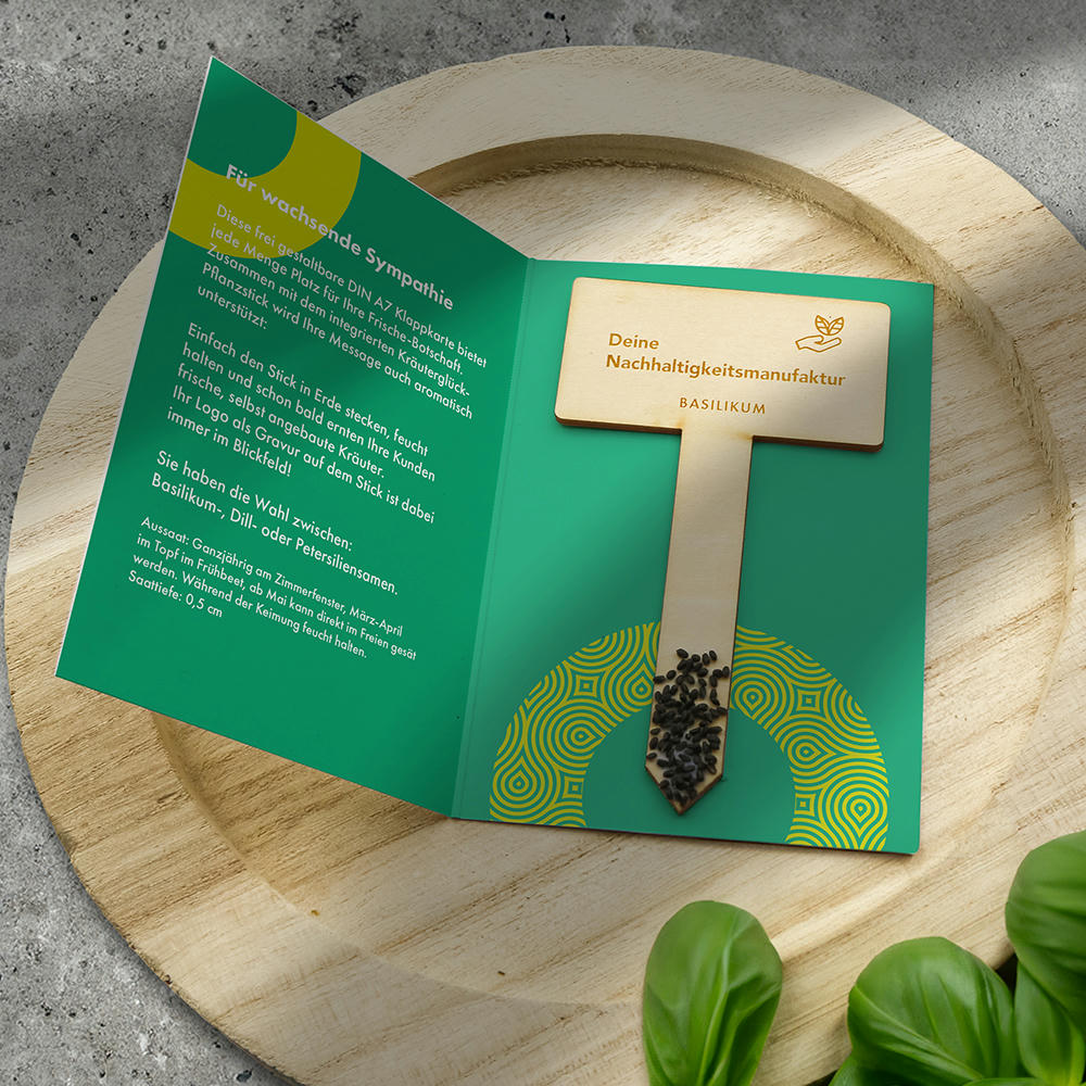 Aromatische Botschaft in Form der frei gestaltbaren DIN A7 Klappkarte mit Logo-Pflanzstick „Kräuterglück“. Einfach den Stick in Erde stecken, feucht halten und das köstliche Aroma selbst angebauter Kräuter genießen – Ihr Logo immer im Blickfeld. Sie haben die Wahl zwischen: Basilikum-, Dill- oder Petersiliensamen. Preis inkl. beidseitigem 4c-Druck auf der Klappkarte. Logogravur auf dem Pflanzstick möglich.