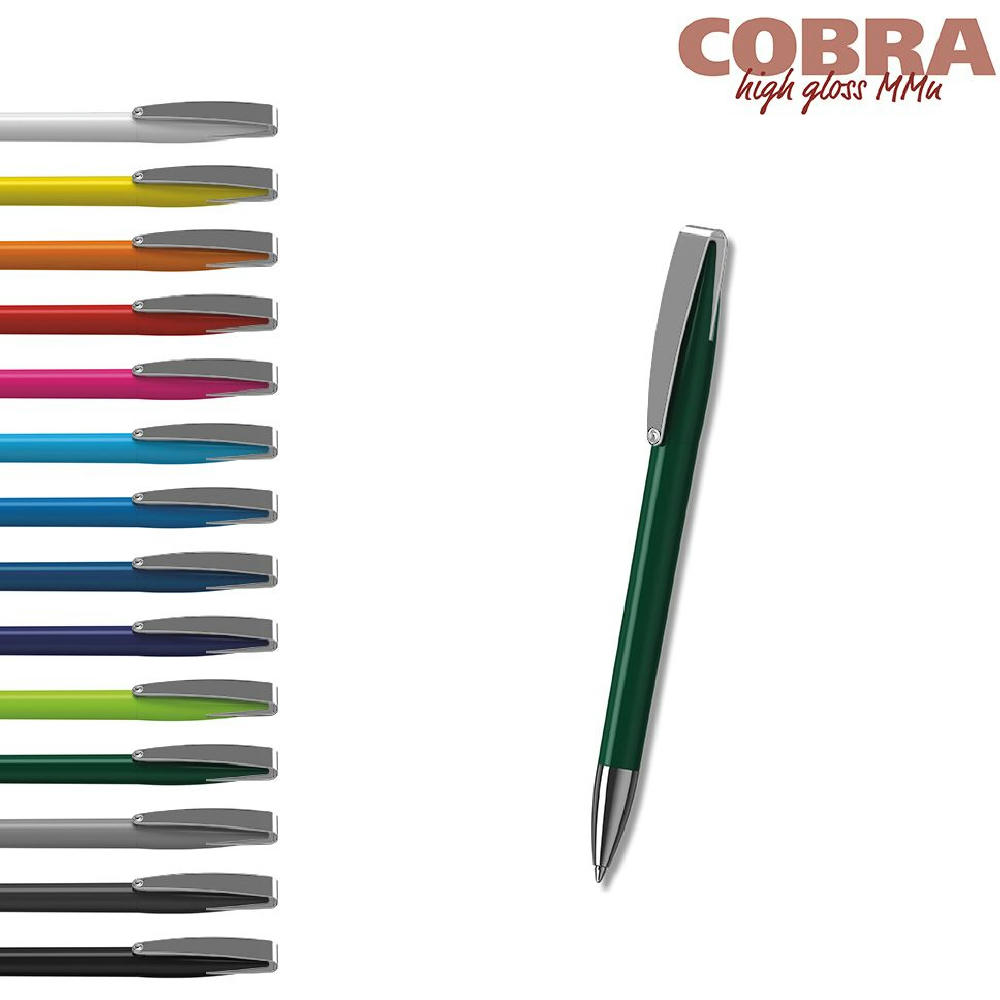 Der Cobra high gloss MMn ist ein Drehkugelschreiber. Materialien und Oberflächen: Spitze: Messing vernickelt. Schaft und Oberteil: Kunststoff (ABS) hochglänzend. Klipp: Federstahl vernickelt. Minenröhrchen: Recyceltes Polypropylen (rPP). Standardfarben: Schaft und Oberteil: aus 14 Farben kombinierbar. Sonderfarben: ab 3.000 Stück, ab 25.000 Stück ohne PMS-Zuschlag. Standardmine: Silktech L (3.000 m), blau oder schwarz, Mine optional: Silktech XL, Multifill P, Multi-Gel.
