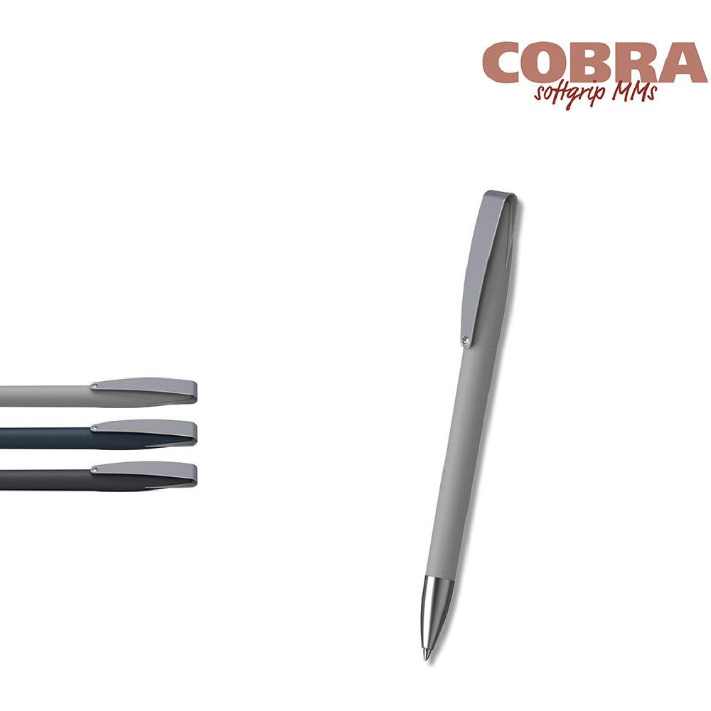Der Cobra softgrip MMs ist ein Drehkugelschreiber. Materialien und Oberflächen: Spitze: Messing mattverchromt. Schaft und Oberteil: Kunststoff (ABS), lackierte Softgrip-Oberfläche. Klipp: Federstahl mattverchromt. Minenröhrchen: Recyceltes Polypropylen (rPP). Standardfarben: Schaft und Oberteil: aus 3 Farben kombinierbar. Sonderfarben: - Standardmine: Silktech L (3.000 m), blau oder schwarz, Mine optional: Silktech XL, Multifill P, Multi-Gel.