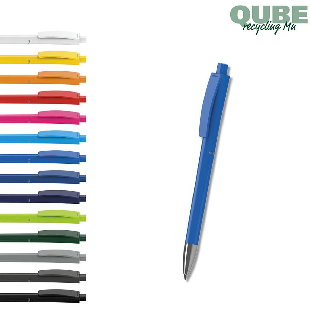 Der Qube recycling Mn ist ein Druckkugelschreiber. Materialien und Oberflächen: Spitze: Messing vernickelt. Schaft, Oberteil und Drücker: Kunststoff (rABS) hochglänzend, recycelt. Minenröhrchen: Recyceltes Polypropylen (rPP). Standardfarben: Schaft, Oberteil und Drücker: aus 14 Farben kombinierbar. Hinweis: Aufgrund der recycelten Rohstoffe kann es zu Farbabweichungen auch bei einzelnen Bauteilen eines Produktes kommen. Sonderfarben: ab 5.000 Stück, ab 25.000 Stück ohne PMS-Zuschlag. Standardmine: Silktech L (3.000 m), blau oder schwarz, Mine optional: Silktech XL, Multifill P, Multi-Gel.