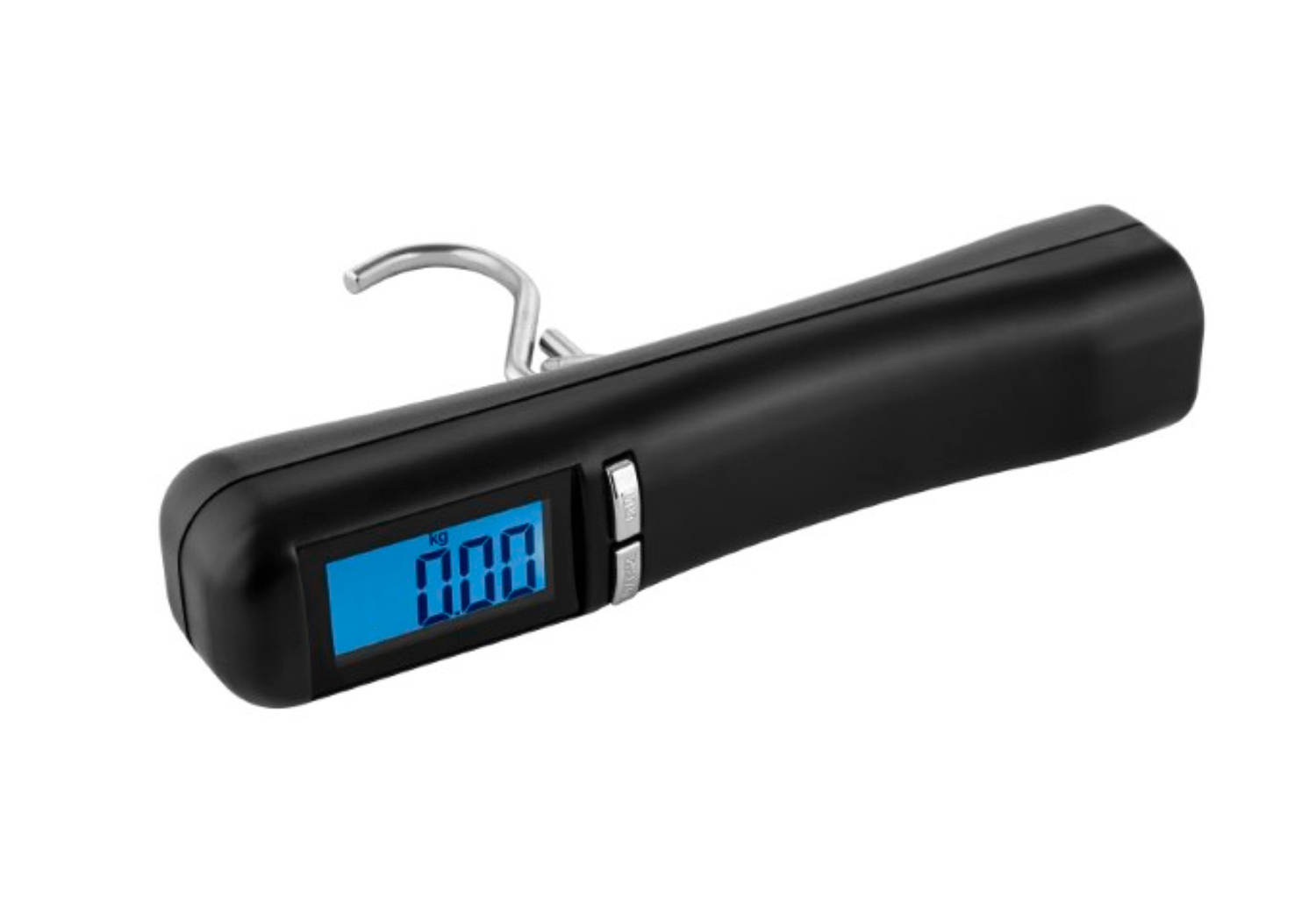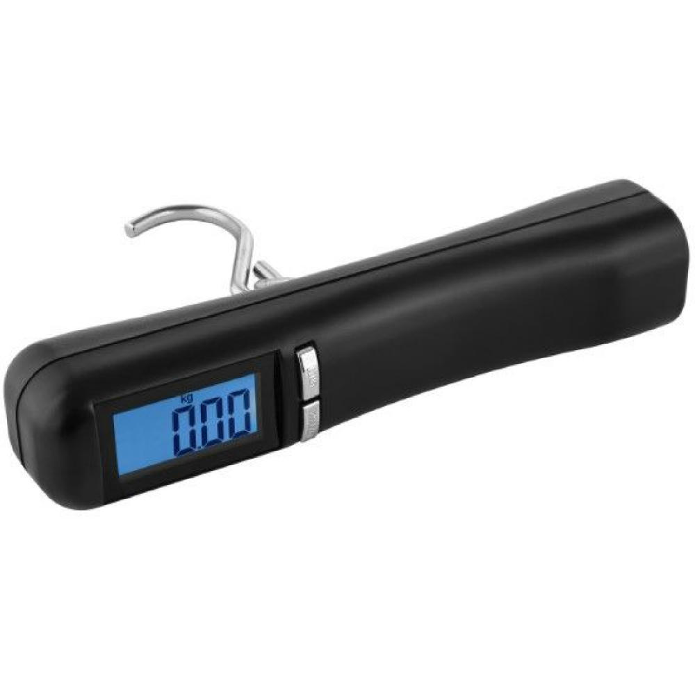 Digitale Kofferwaage mit blau hinterleuchtetem Display. Belastbarkeit bis 40 kg, Edelstahlhaken. Die kompakte Größe passt in jede Tasche. 2 AAA-Batterien inklusive. Elegante Craft-Paper-Box aus recyceltem Papier.