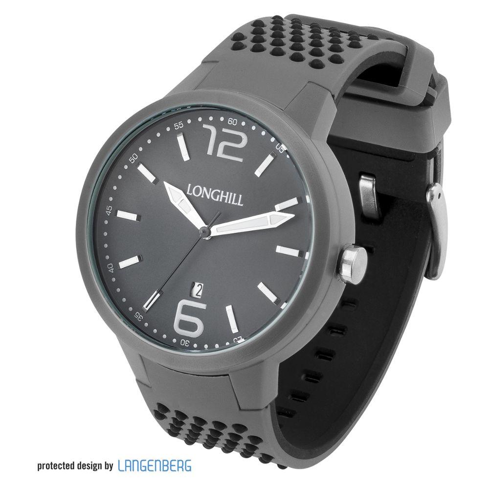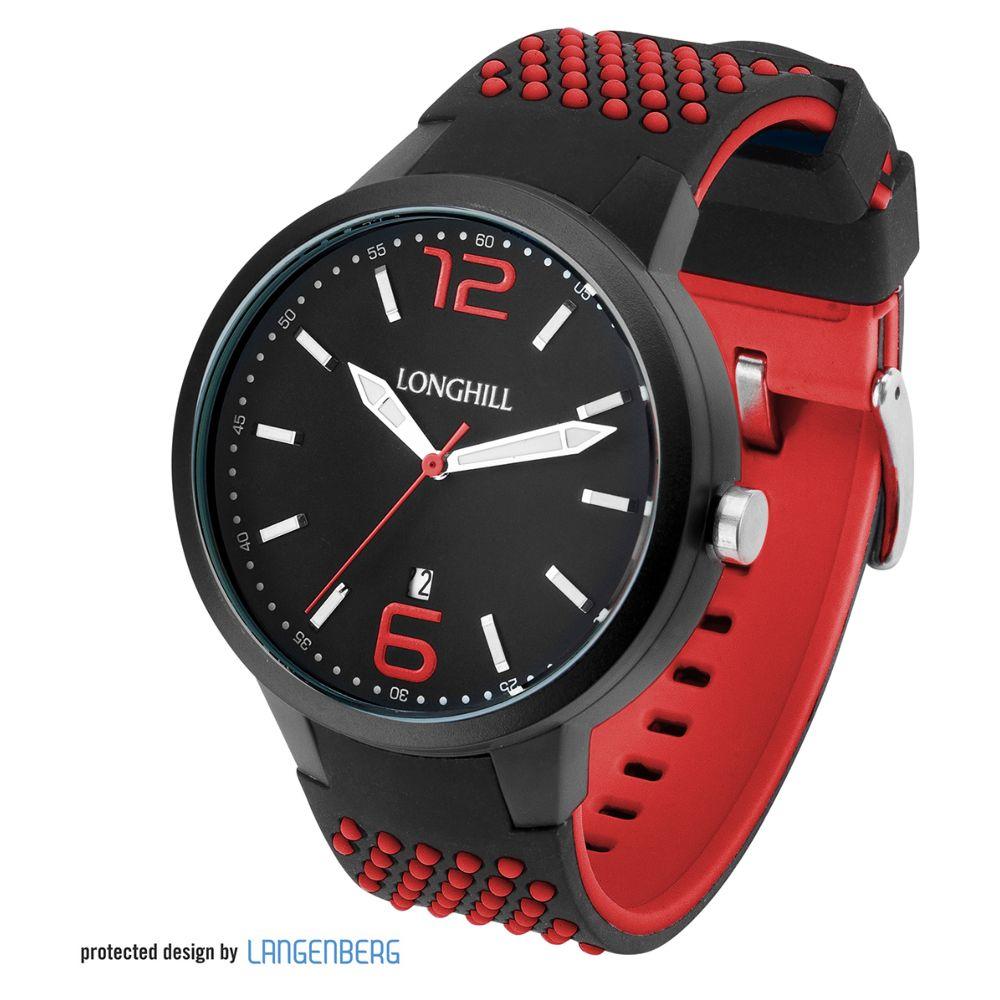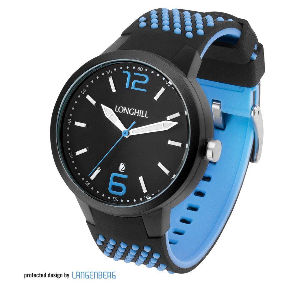 Ausstattung: Gehäusetiefe: 11 mm, Uhrwerk: PC 32, Zifferblatt schwarz mit Datum, Index Applikationen, Zeiger silber/leuchtend, Sek,blau, Gehäuseboden Edelstahl, 3 ATM water proof, Kunststoffarmband Bi-color, schwarz-blau 20 mm