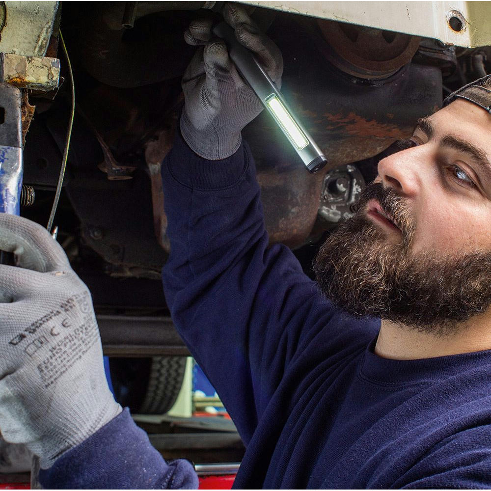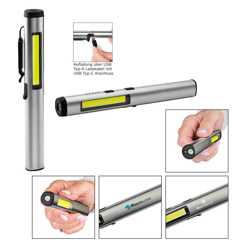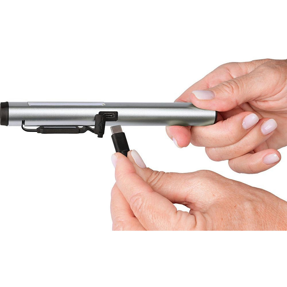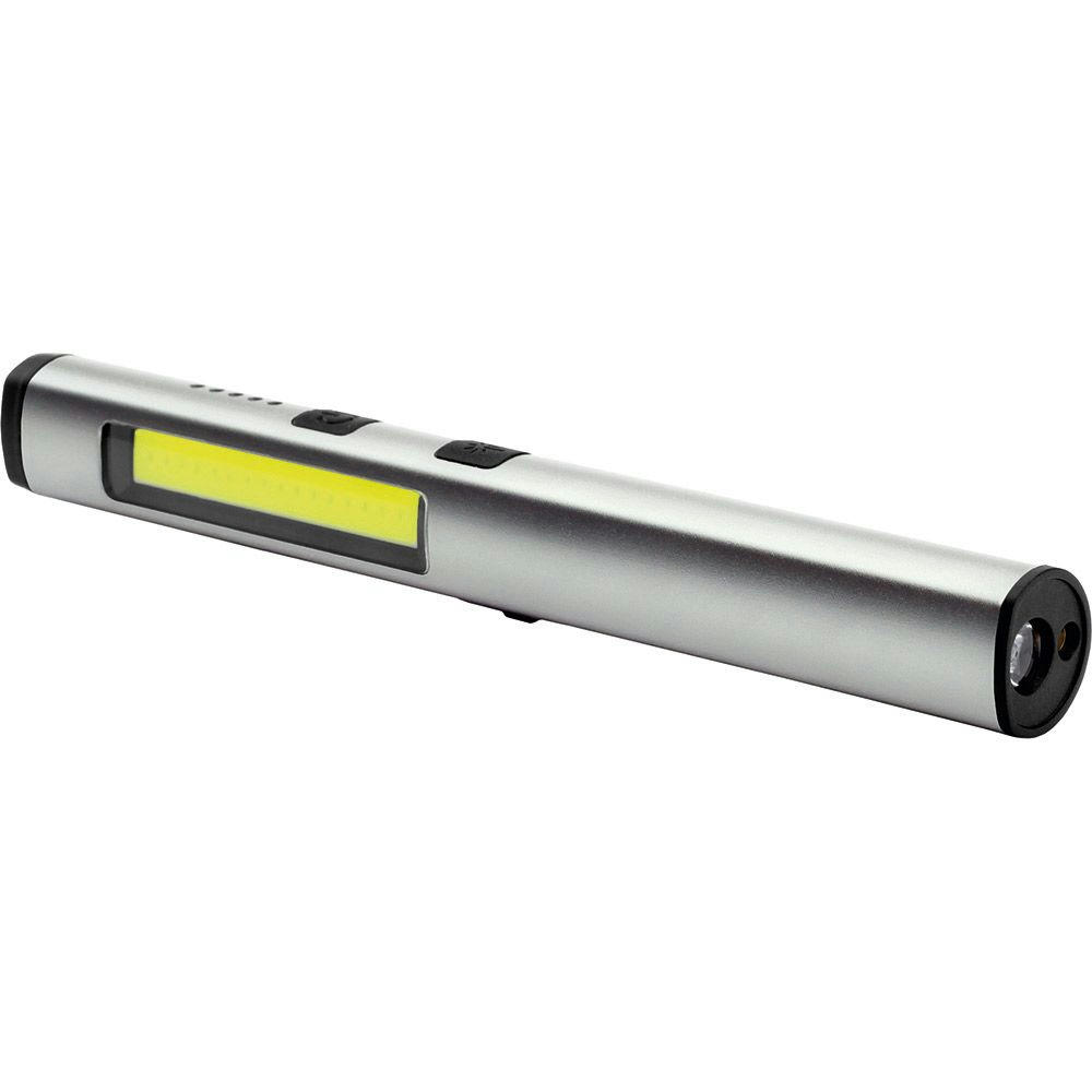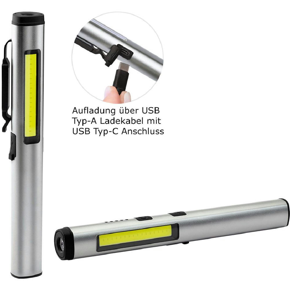 Gehäuse: Aluminium eloxiert. Leuchtmittel: Frontleuchte 5 W COB LED, Inspektionsleuchte 3 W LED, Laser 650 nm, UV-Licht 365 nm. Lichtwerte: Frontleuchte 450 Lumen, Inspektionsleuchte 140 Lumen. Ladezeit: ca. 3 Stunden. Leuchtdauer: ca. 2,5 Stunden (Frontleuchte 450 Lumen), ca. 2,5 Stunden (Inspektionsleuchte 140 Lumen), ca. 4 Stunden (UV-Licht). Leuchtmodi: Frontleuchte 100 % Power weißes Licht dimmbar, Inspektionsleuchte 100 % Power weißes Licht dimmbar, UV-Licht blau dimmbar, Laser rot. Equipment: 120° drehbarer Clip mit starkem Magnet, Ladekontroll-LED, USB (Typ A) / USB (Typ C) Ladekabel (50 cm Länge). Schutzklasse: IPX2. Stromversorgung: 3,7V 800mAh Li-Ionen Akku Typ 14500 (inkl.). Verpackung: schwarze Geschenkverpackung.